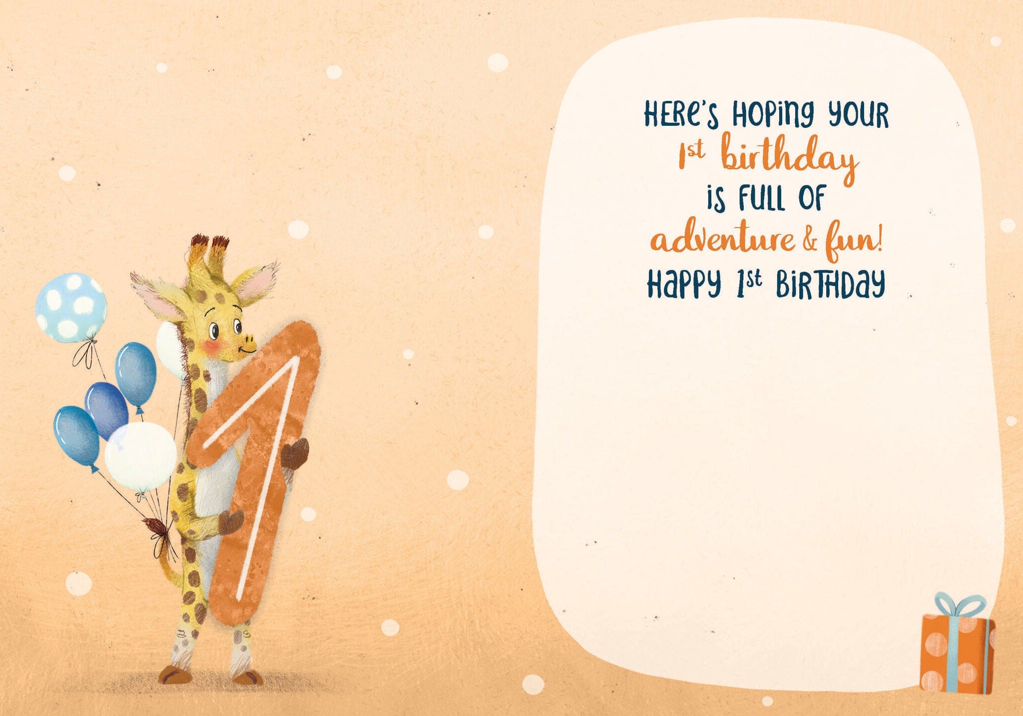 5″x7″ card with colour coordinating envelope. Inside: Here’s hoping your 1st birthday is full of adventure & fun!. Printed in Canada