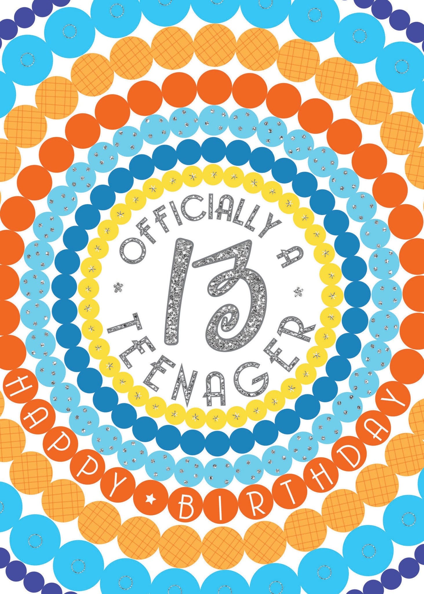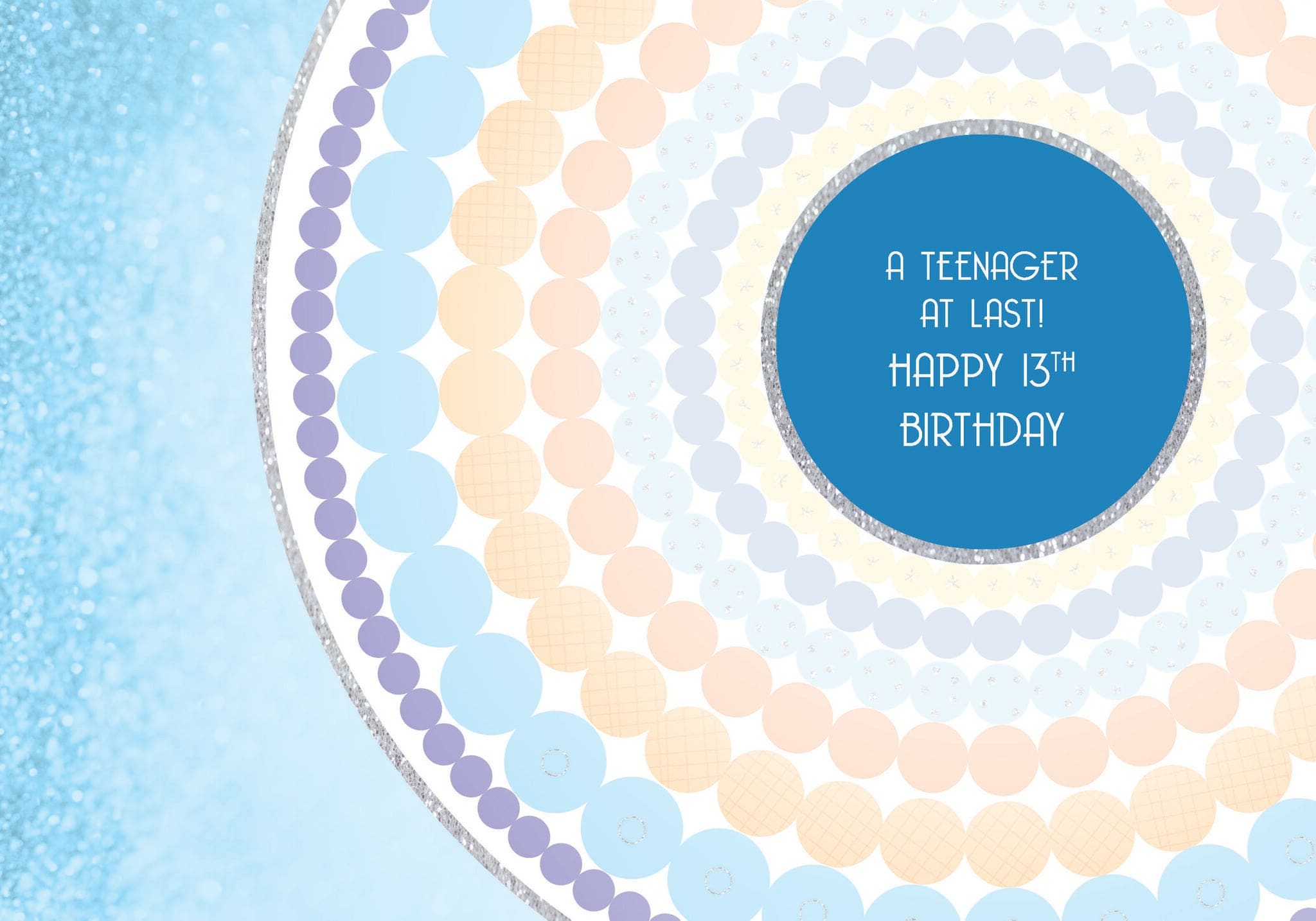 5″x7″ card with colour coordinating envelope. Inside: A teenager at last! Happy 13th Birthday. Printed in Canada