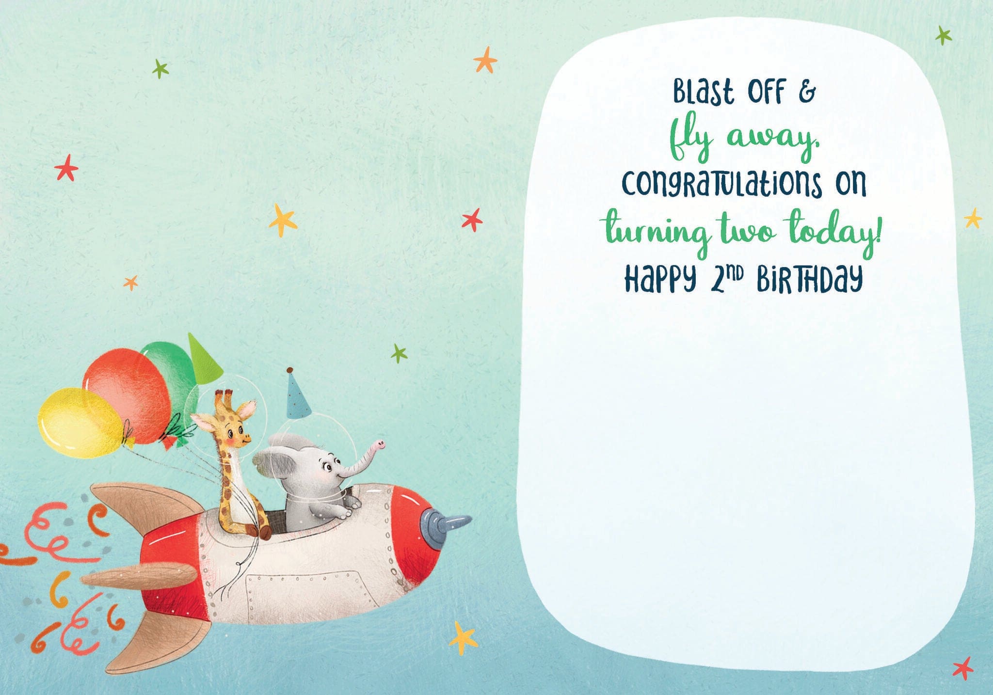 5″x7″ card with colour coordinating envelope. Inside: Blast off & fly away, congratulations on turning two today! Printed in Canada
