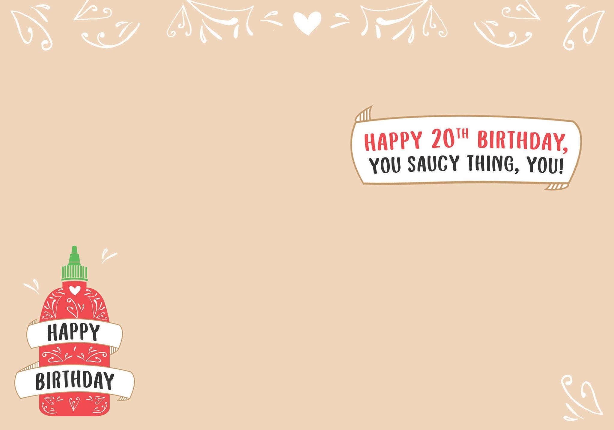 5″x7″ card with colour coordinating envelope. Inside: Happy 20th birthday, you saucy thing, you! Printed in Canada