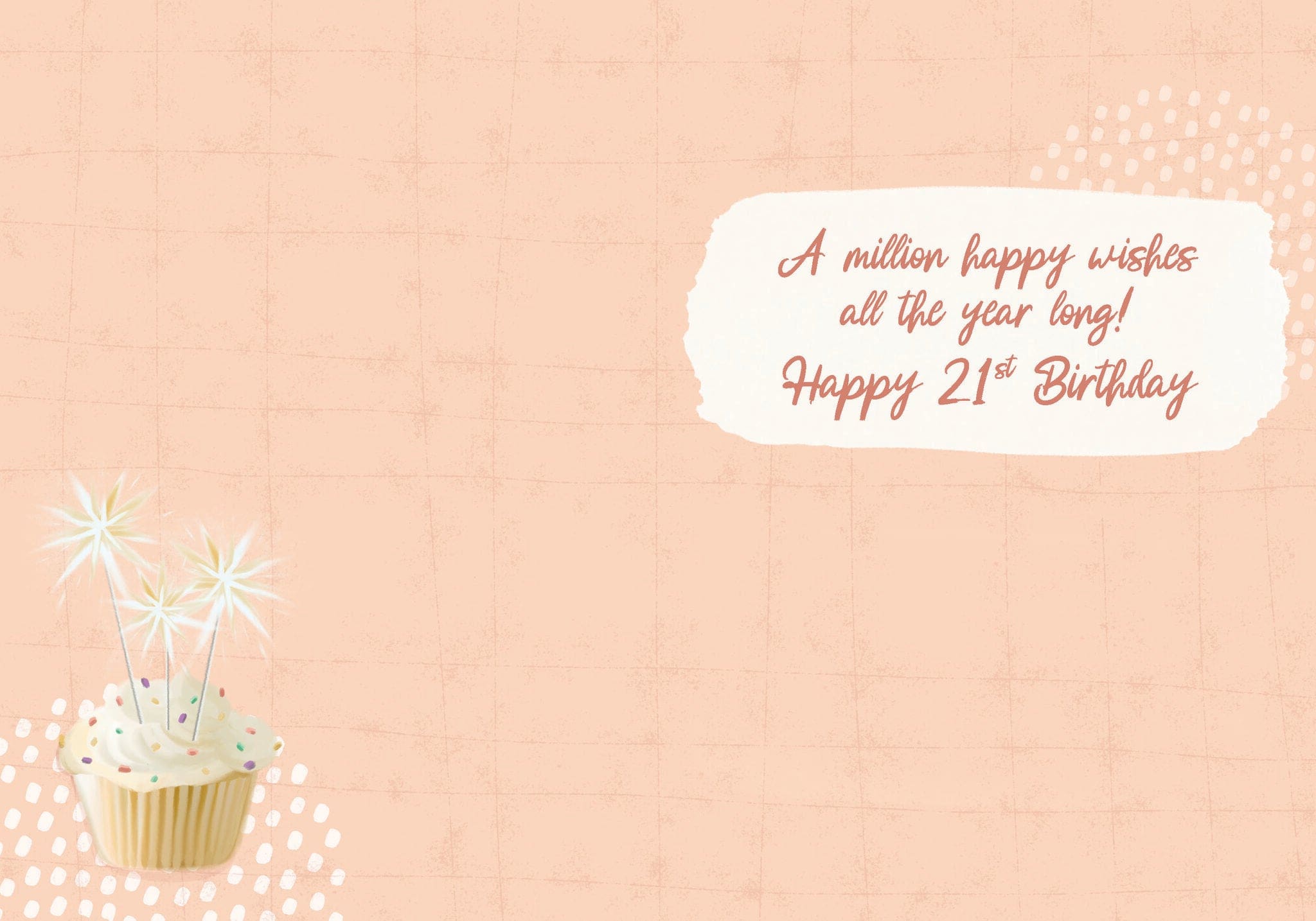 5″x7″ card with colour coordinating envelope. Inside: A million happy wishes all the year long! Happy 21st Birthday. Printed in Canada