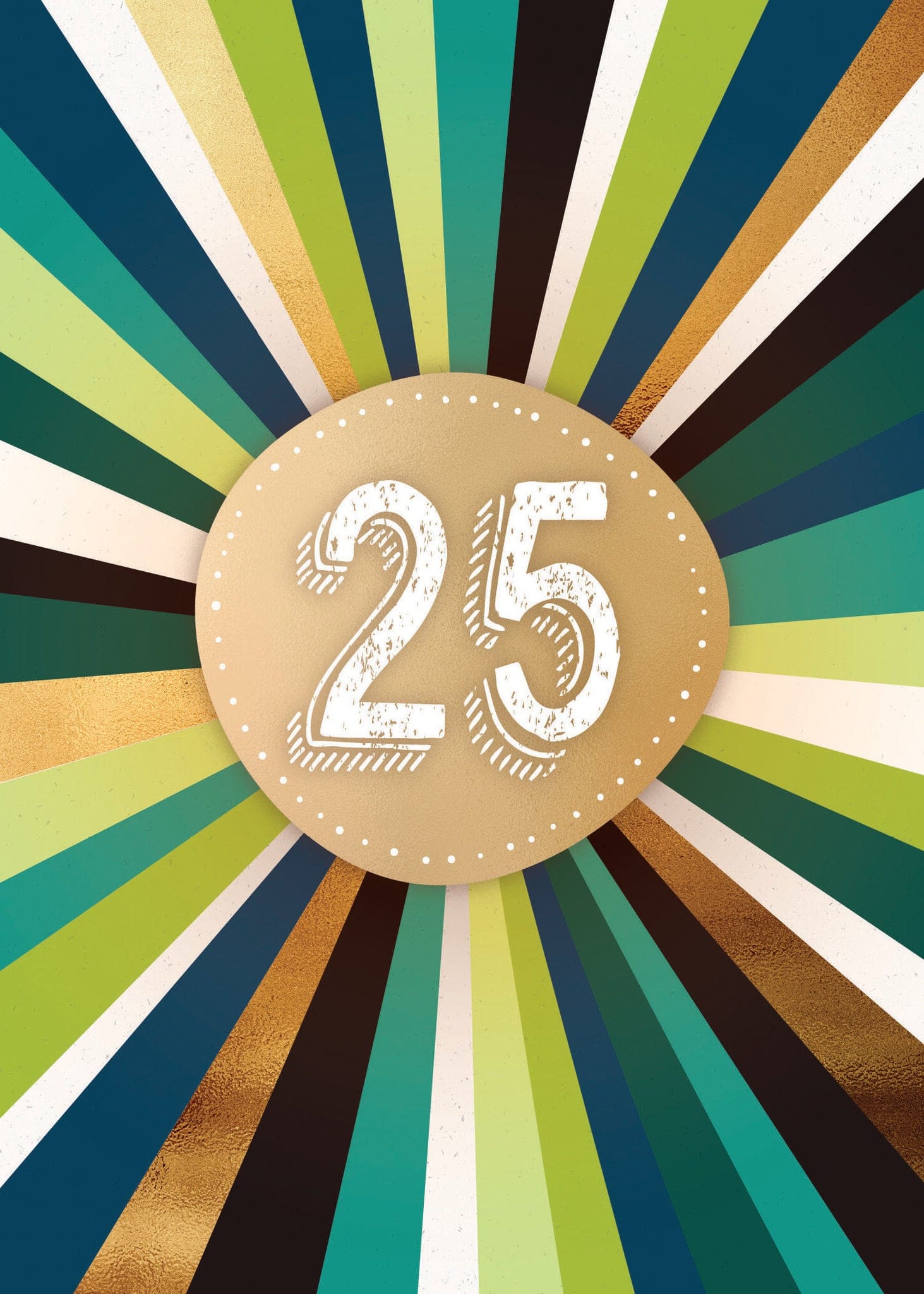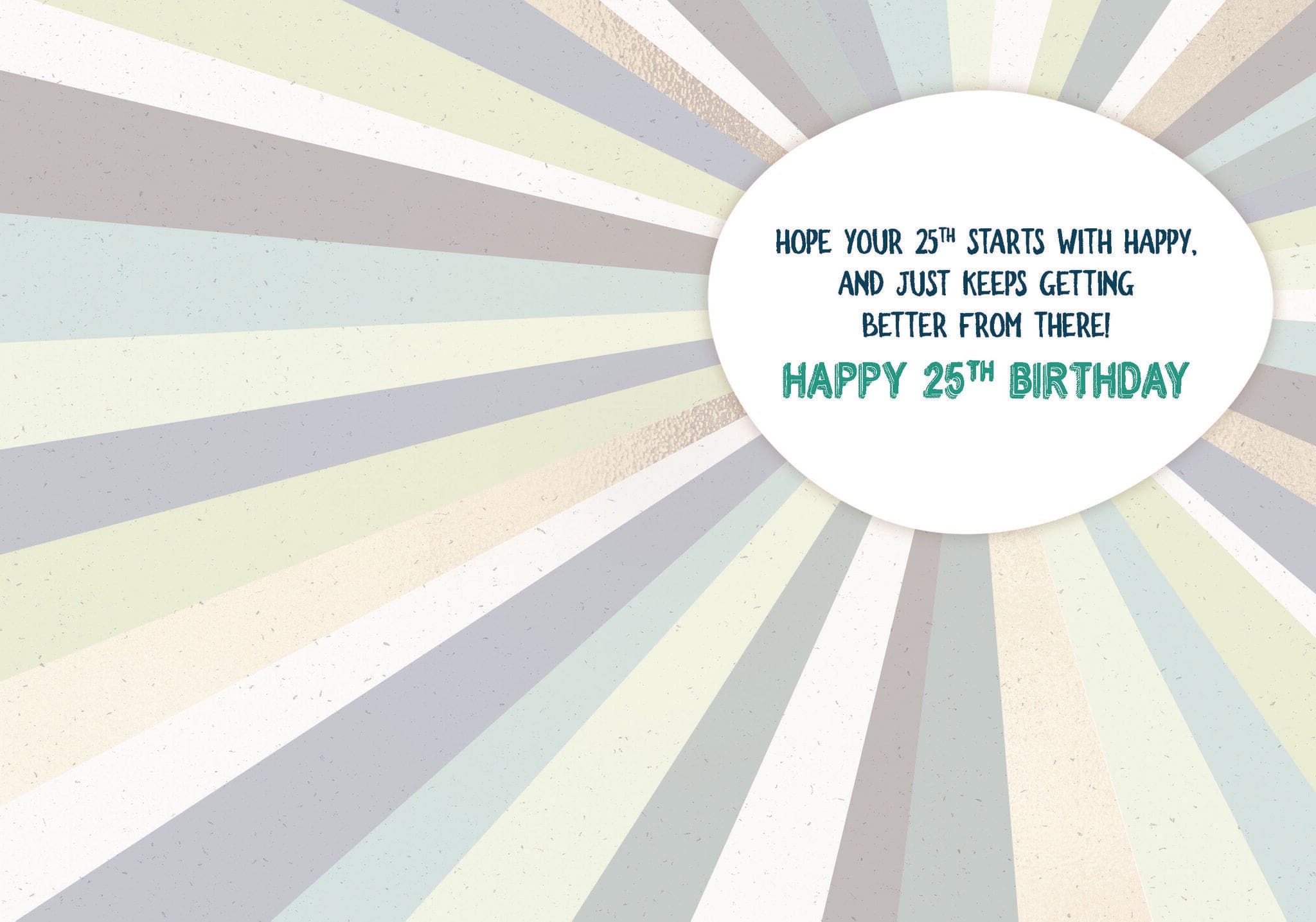 5″x7″ card with colour coordinating envelope. Inside: Hope your 25th begins with Happy, and just keeps getting better from there. Happy Birthday. Printed in Canada