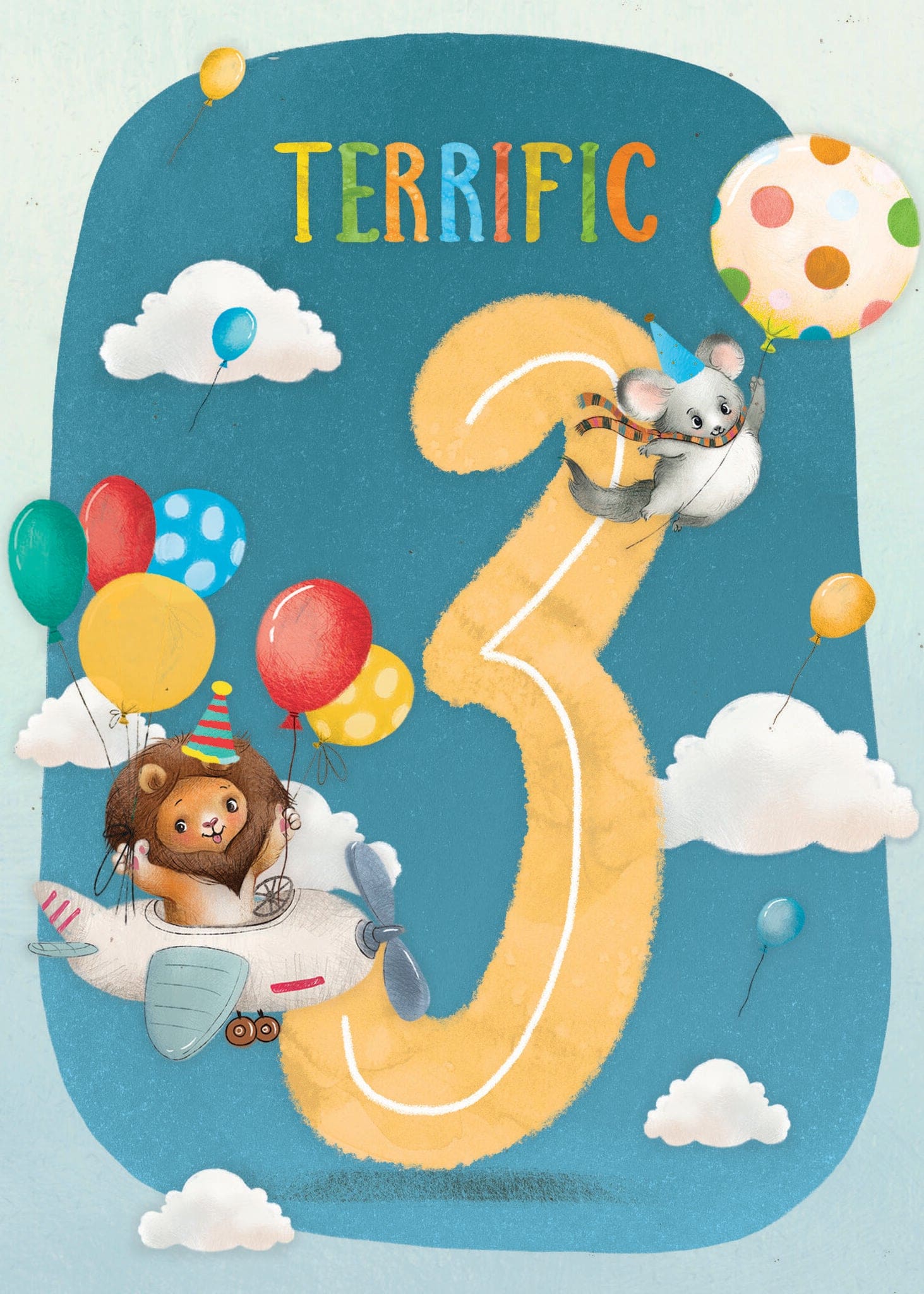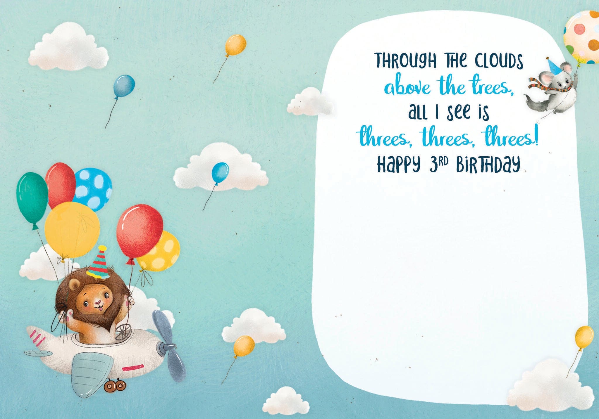 5″x7″ card with colour coordinating envelope. Inside: Through the clouds above the trees, all I see is threes, threes, threes! Happy 3rd Birthday. Printed in Canada