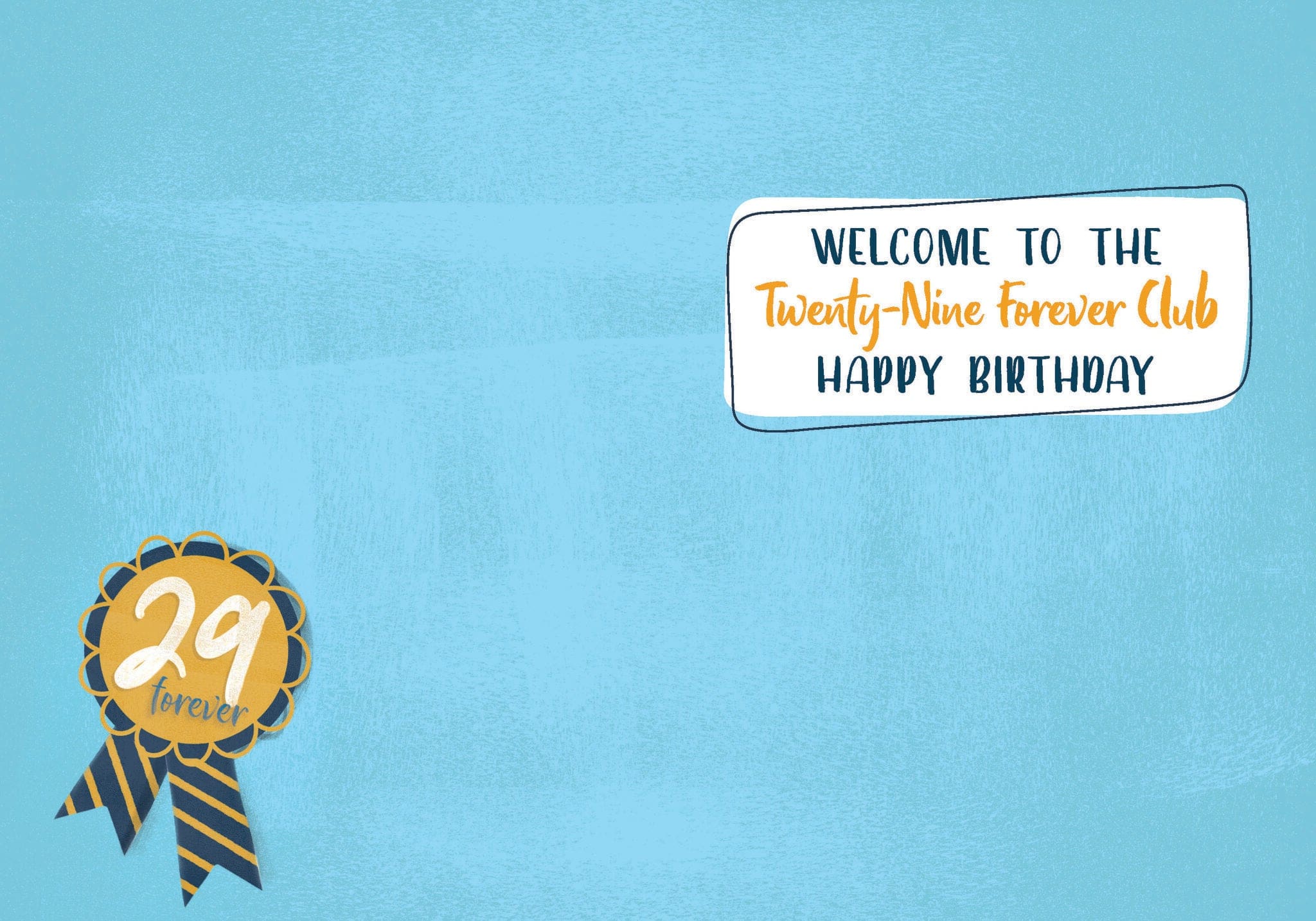 5″x7″ card with colour coordinating envelope. Inside: Welcome to the Twenty-Nine Forever Club. Happy Birthday. Printed in Canada