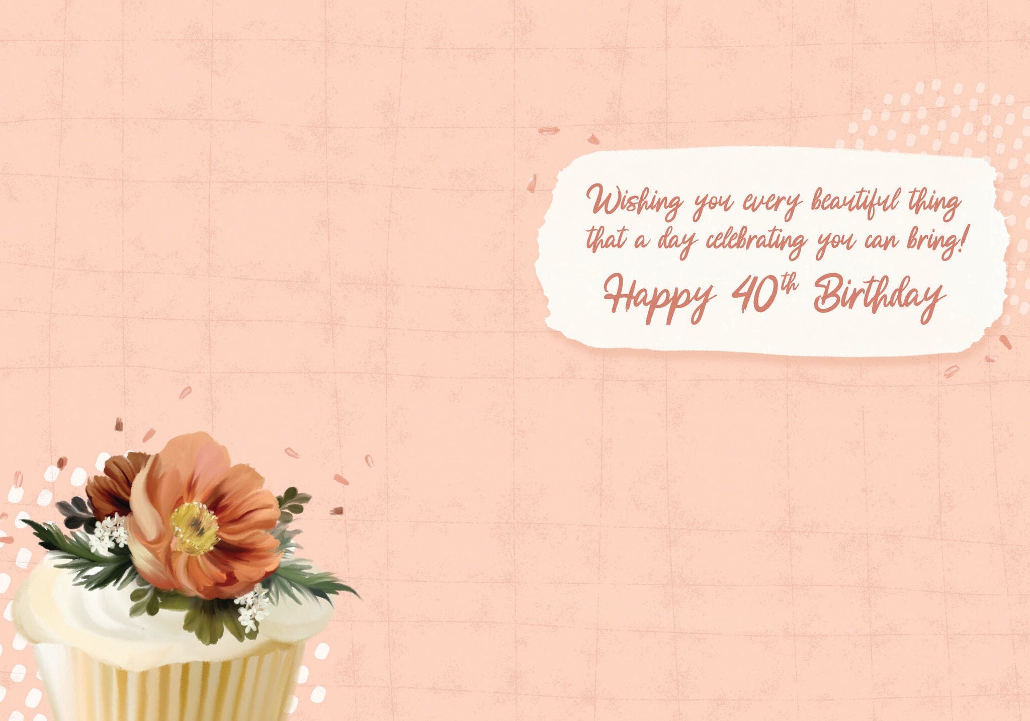 5″x7″ card with colour coordinating envelope. Inside: Wishing you every beautiful thing that a day celebrating you can bring. Happy 40th Birthday. Printed in Canada