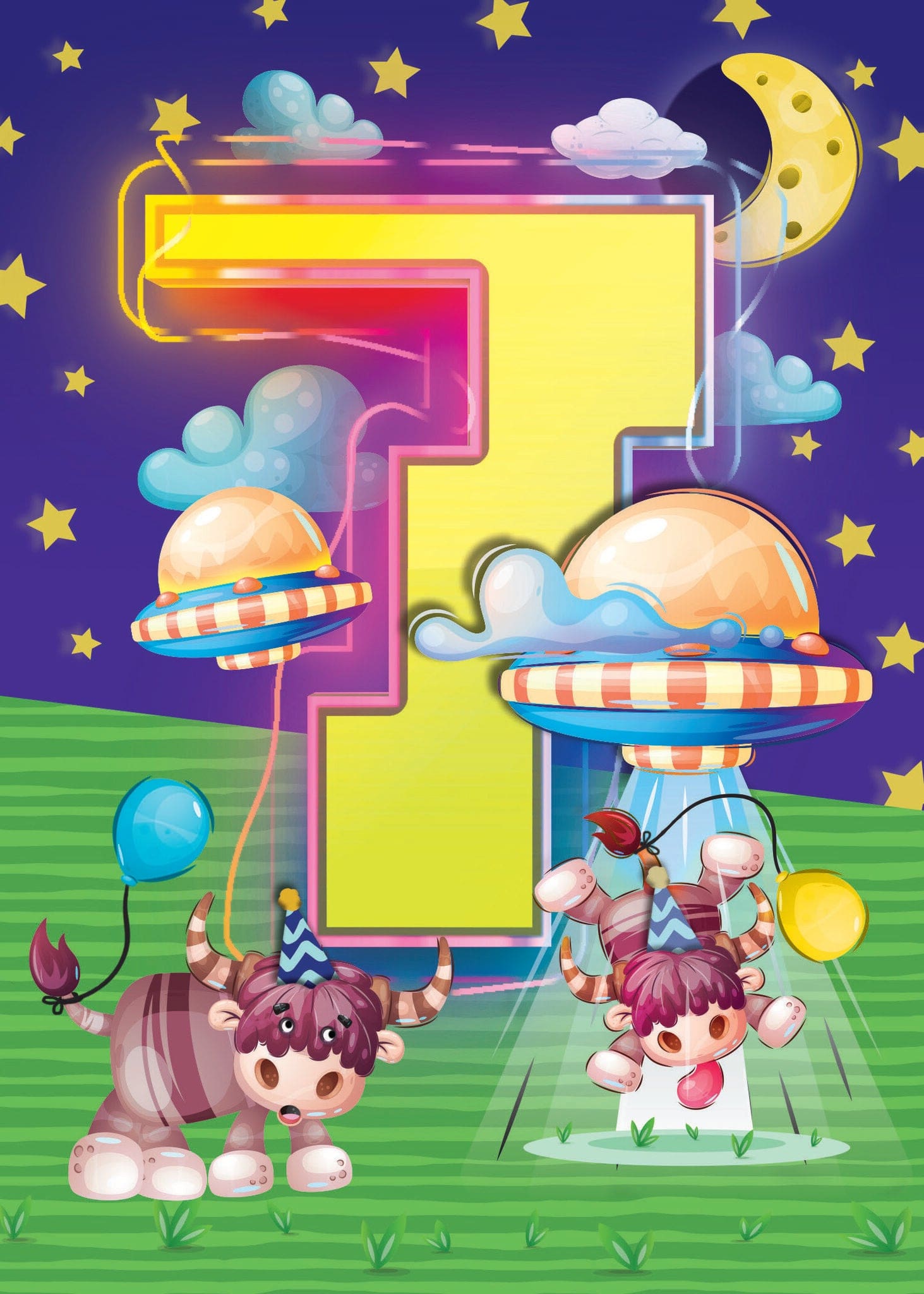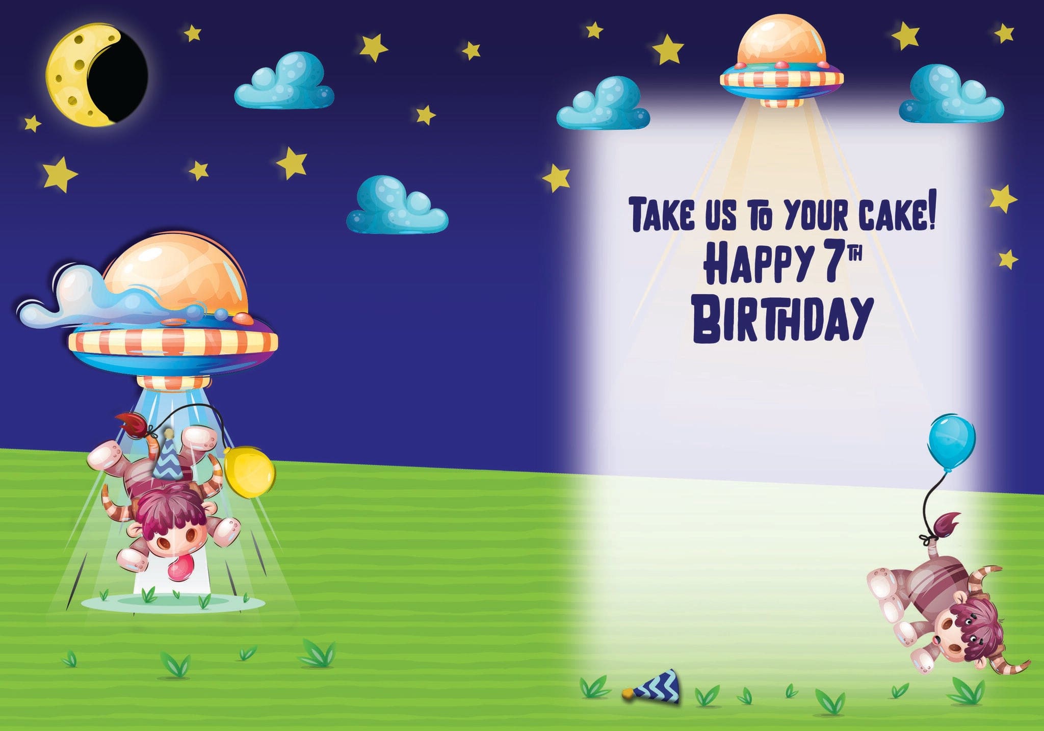 5″x7″ card with colour coordinating envelope. Inside: Take us to your cake! Happy 7th Birthday. Printed in Canada