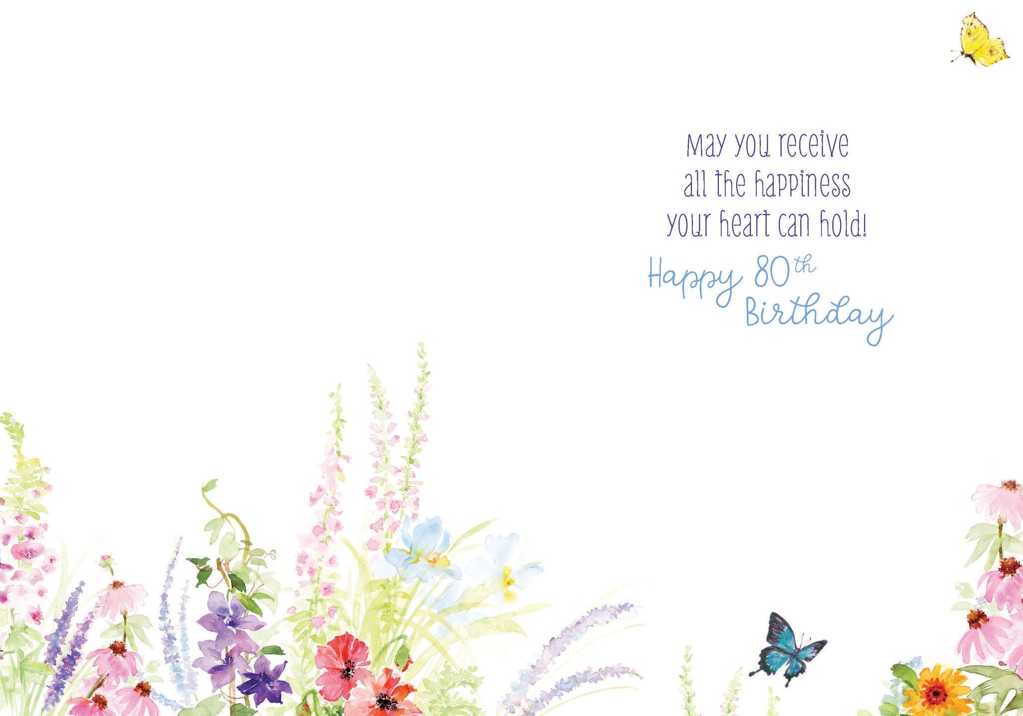 5″x7″ card with colour coordinating envelope. Inside: May you receive all the happiness your heart can hold! Happy 80th Birthday. Printed in Canada