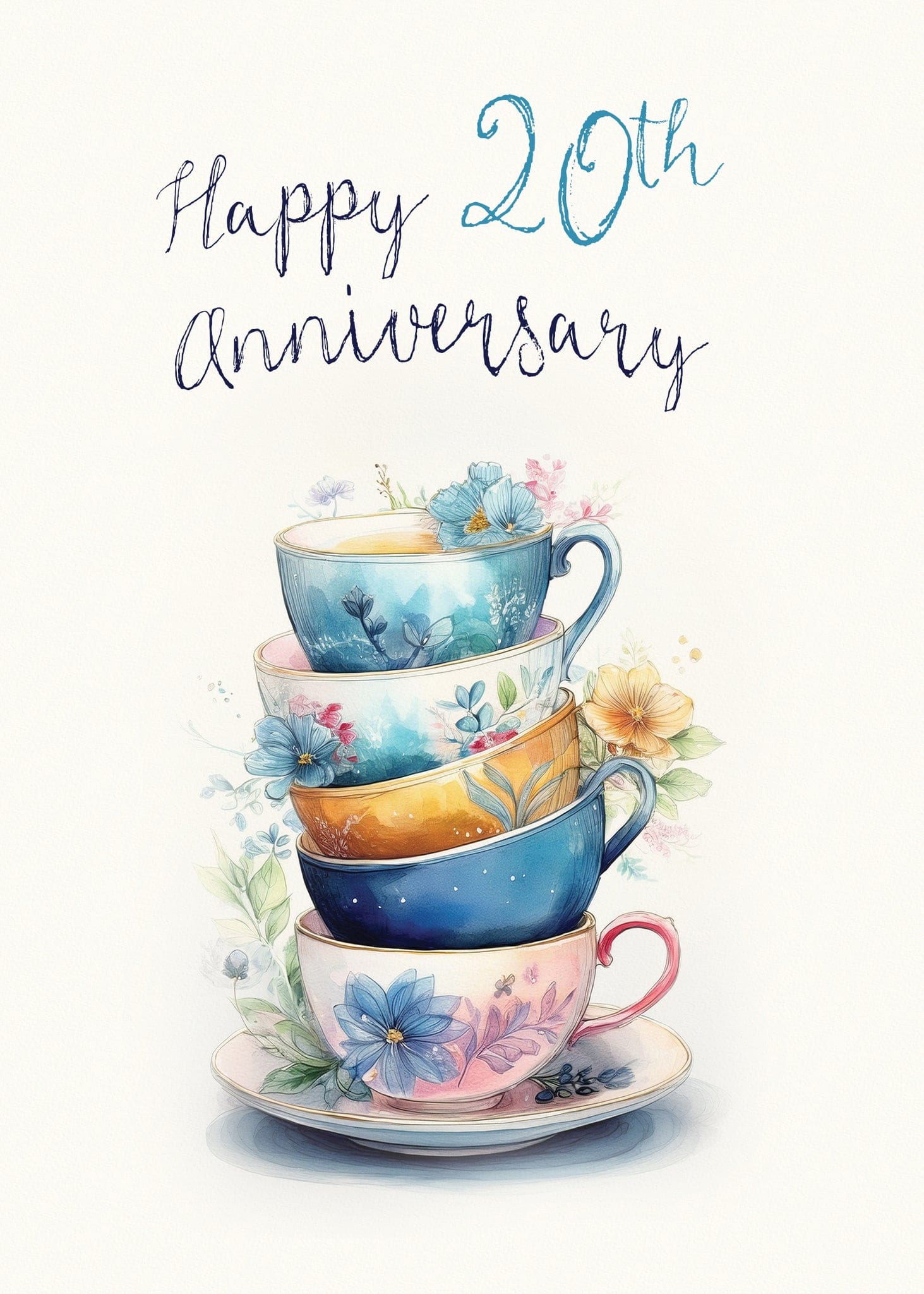 5″x7″ card with colour coordinating envelope. Inside: The years are stacking up, but my love for you is stronger than ever. Happy 20th Anniversary. Printed in Canada.