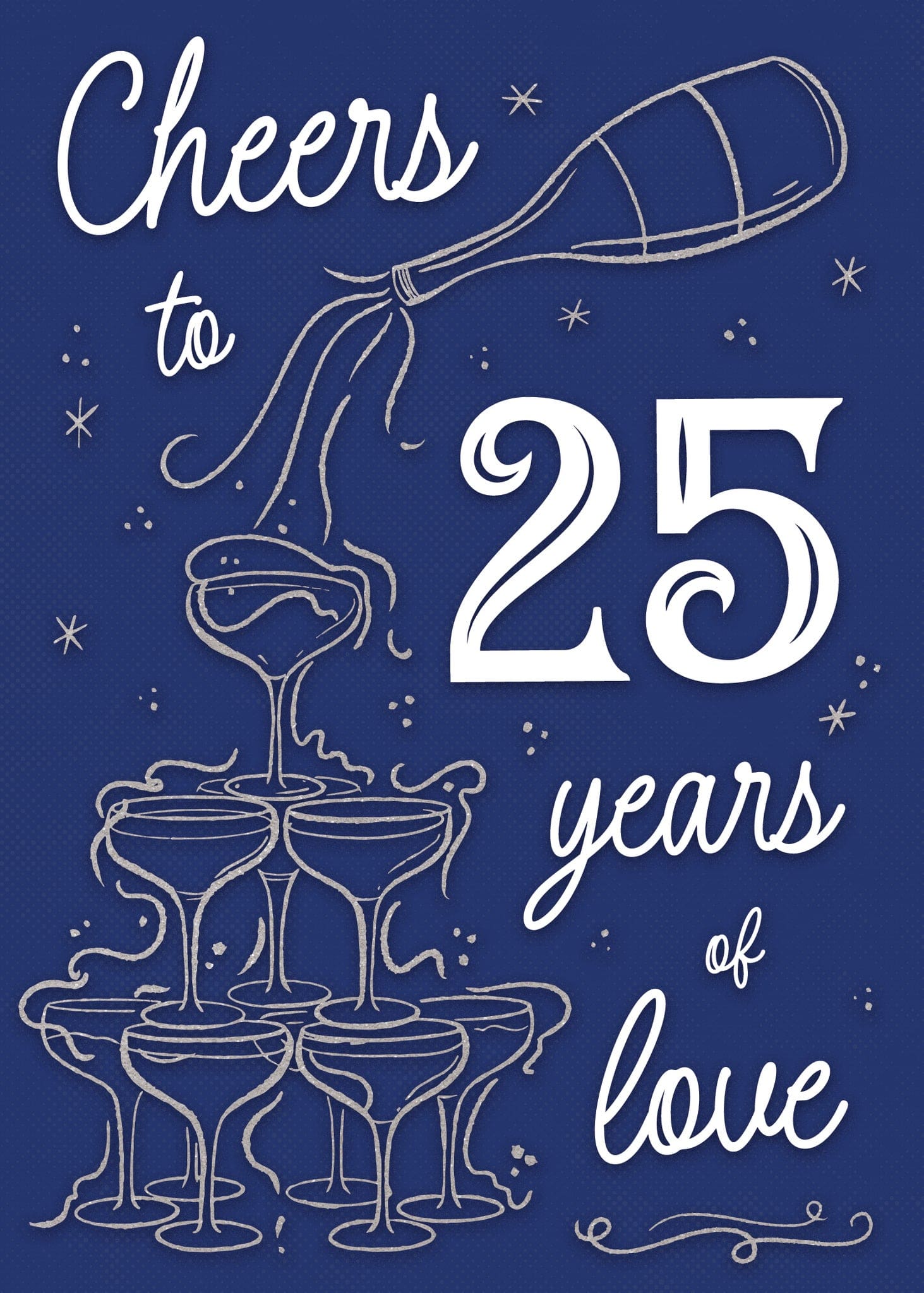 5″x7″ card with colour coordinating envelope. Inside: Celebrating twenty-five years of love, laughter, and beautiful memories. Happy Anniversary. Printed in Canada.