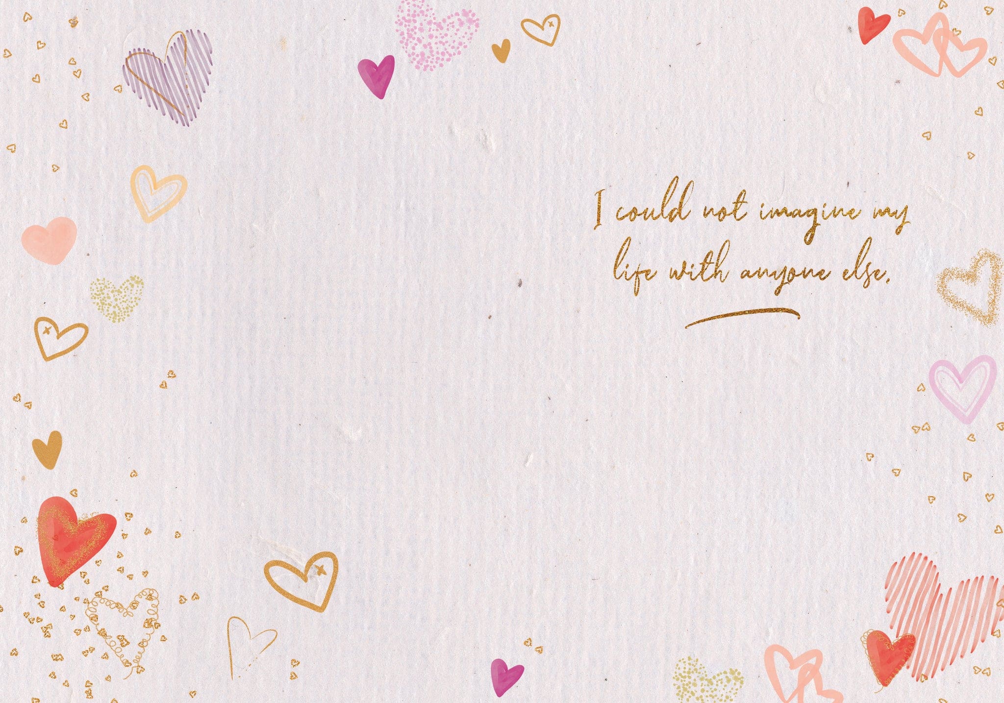 Each card measures 5″x7″ (13cmx18cm) and is printed in full colour on linen paper, comes with a coordinating colour envelope. Printed in Canada. Inside greeting: I could not imagine my life with anyone else.