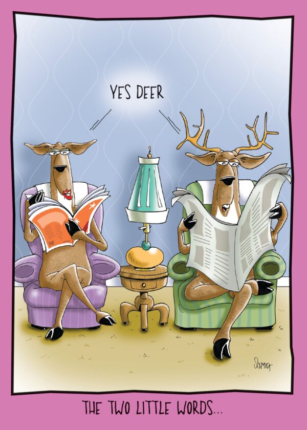 5 x 7″ greeting card printed in full-colour with a colour coordinated envelope. INSIDE: That make a happy relationship. Happy Anniversary. Printed in Canada