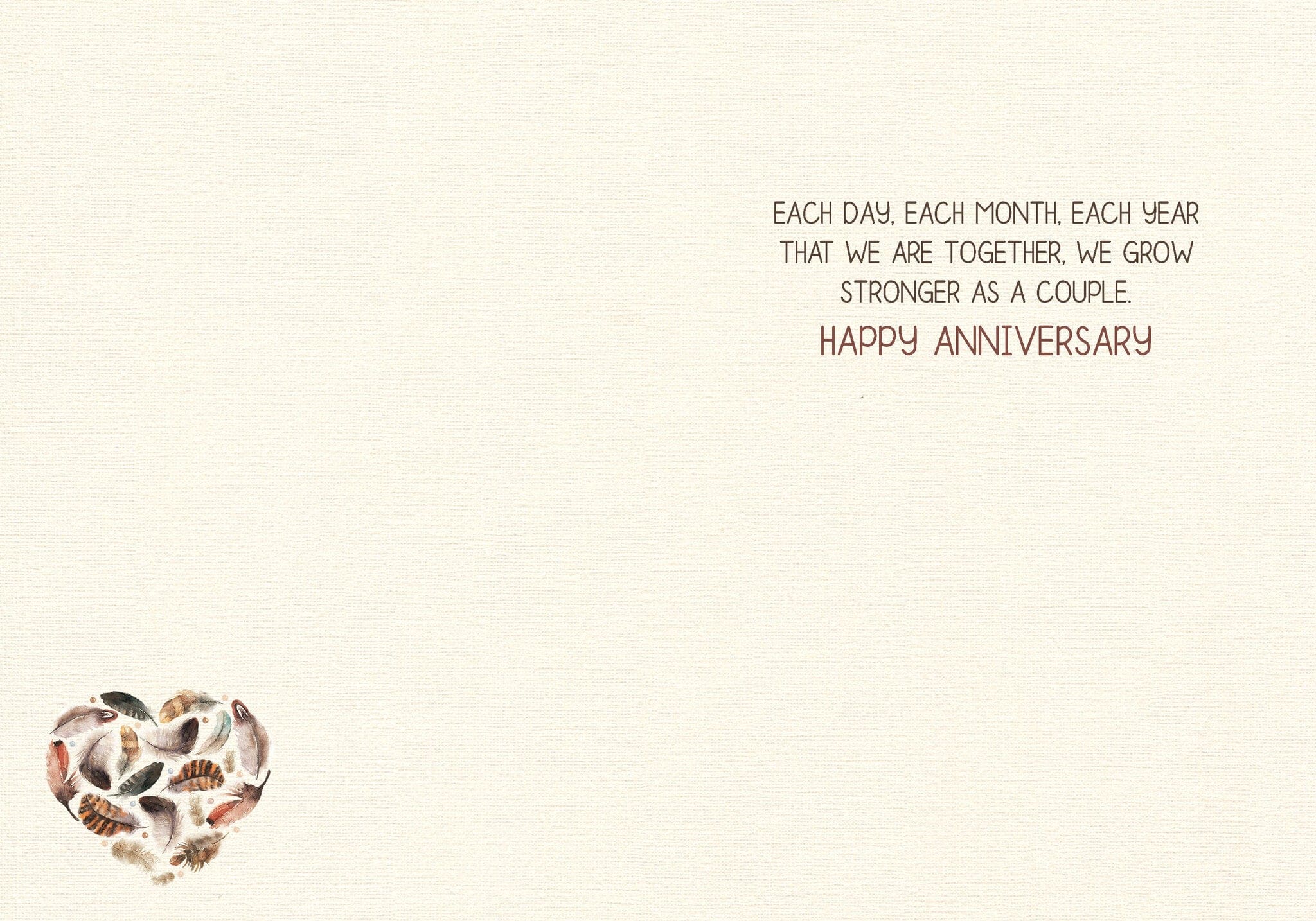 5″x7″, printed on linen paper, with coordinating envelope. Printed in Canada. Inside greeting: each day, each month, each year that we are together, we grow stronger as a couple. Happy Anniversary