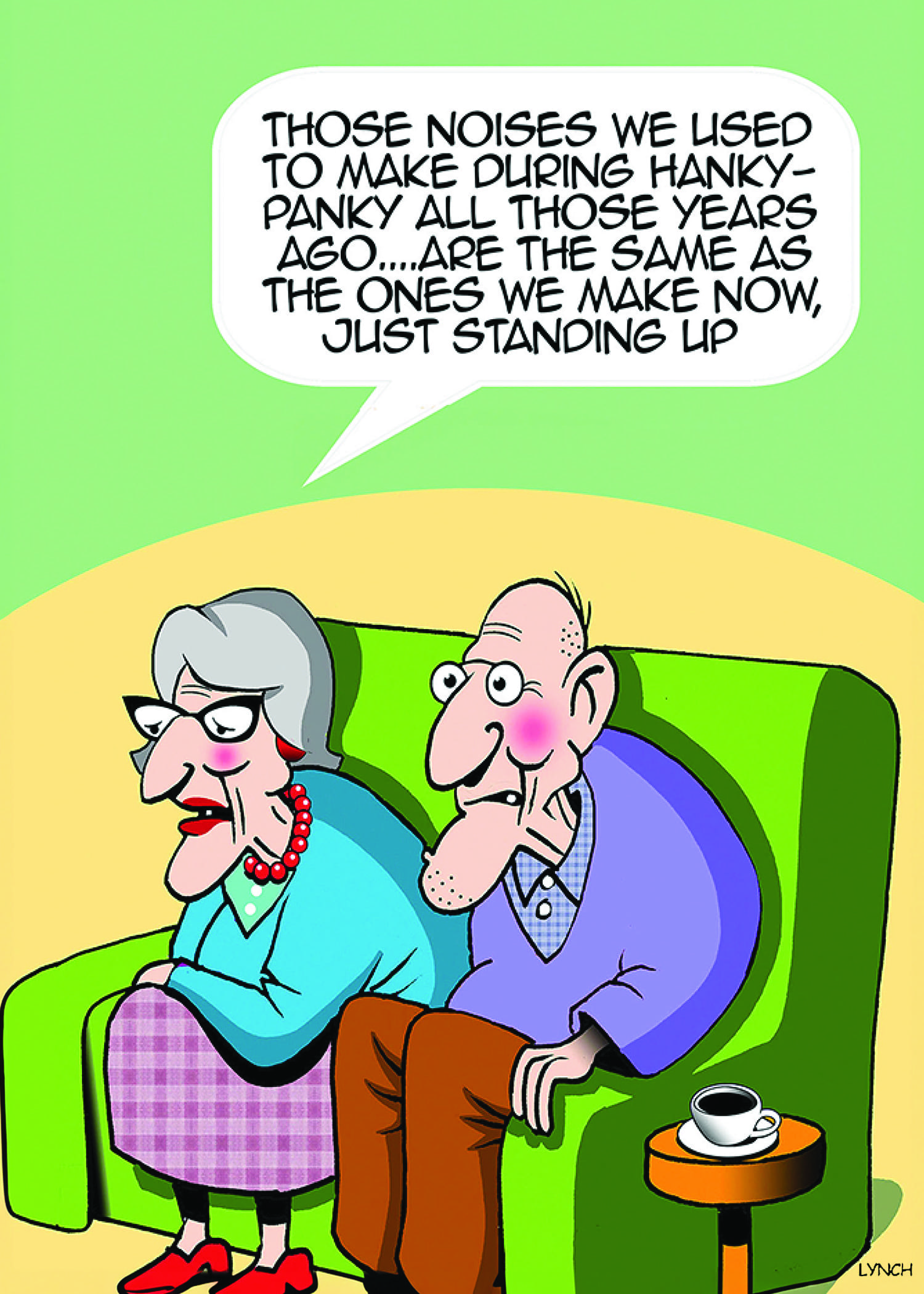 Mark Lynch Humor 5″x7″ cards. INSIDE: From creaking bedsprings to creaking bones. Happy Anniversary!