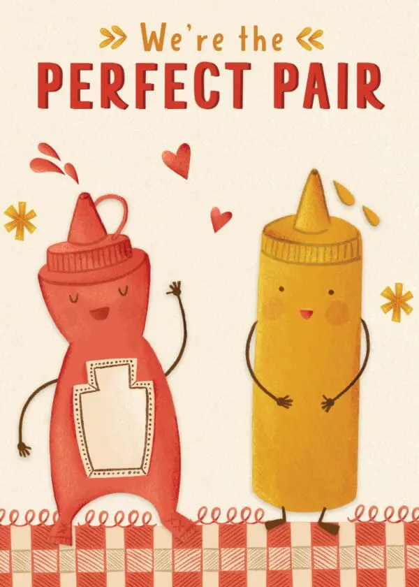4.5″x6.25″, printed on linen paper, with coordinating envelope. Printed in Canada. Inside greeting: Here’s to a love that complements one another perfectly. Happy Anniversary