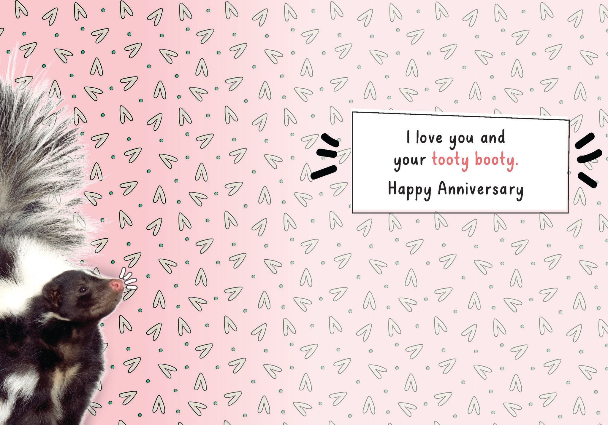 Each card measures 5″x7″ (13cmx18cm) and is printed in full colour on coated paper, comes with a coordinating colour envelope. Printed in Canada. Inside greeting: I love you and your tooty-booty. Happy Anniversary