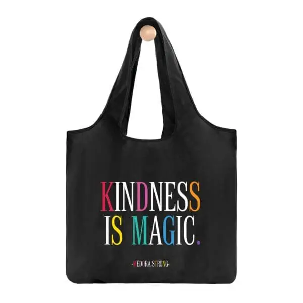 27″ x 15″ x 6″ with extra long shoulder handles. Made with 100% ripstop nylon. Water resistant. Expandable bottom. Holds up to 50 pounds. kindness is magic