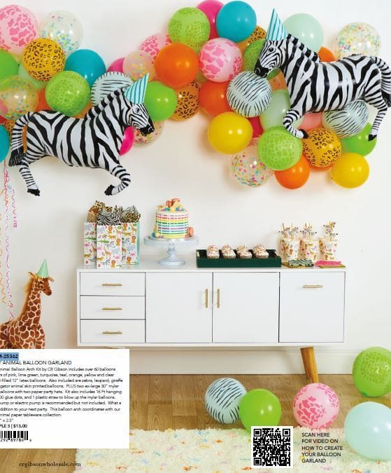 Incl. over 60 balloons in pink, lime green, turq, teal, orange, yellow and clear confetti filled 12″ w animal prints in zebra, leopard, giraffe and alligator, 2 ex-large 30″ mylar Zebra balloons, 16 Ft hanging strip, 80 glue dots.