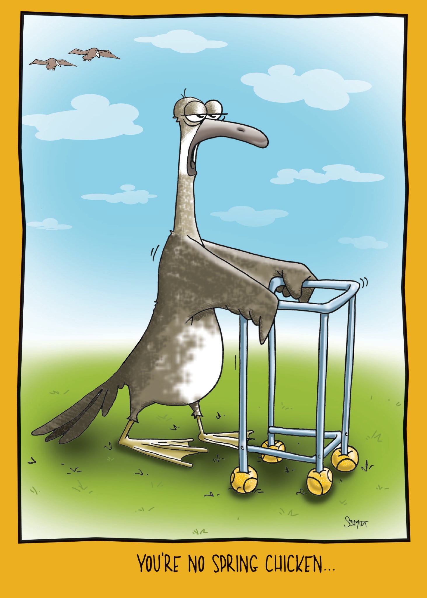 5 x 7″ greeting card printed in full-colour with a colour coordinated envelope. INSIDE: But you’re not a “geeser” either. Happy Birthday. Printed in Canada