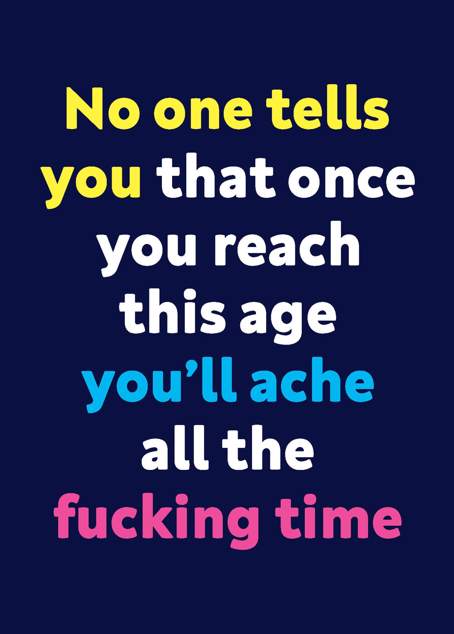 This greeting card measures 5″ x 7″. INSIDE: Everything. Fucking. Hurts. Happy Birthday!