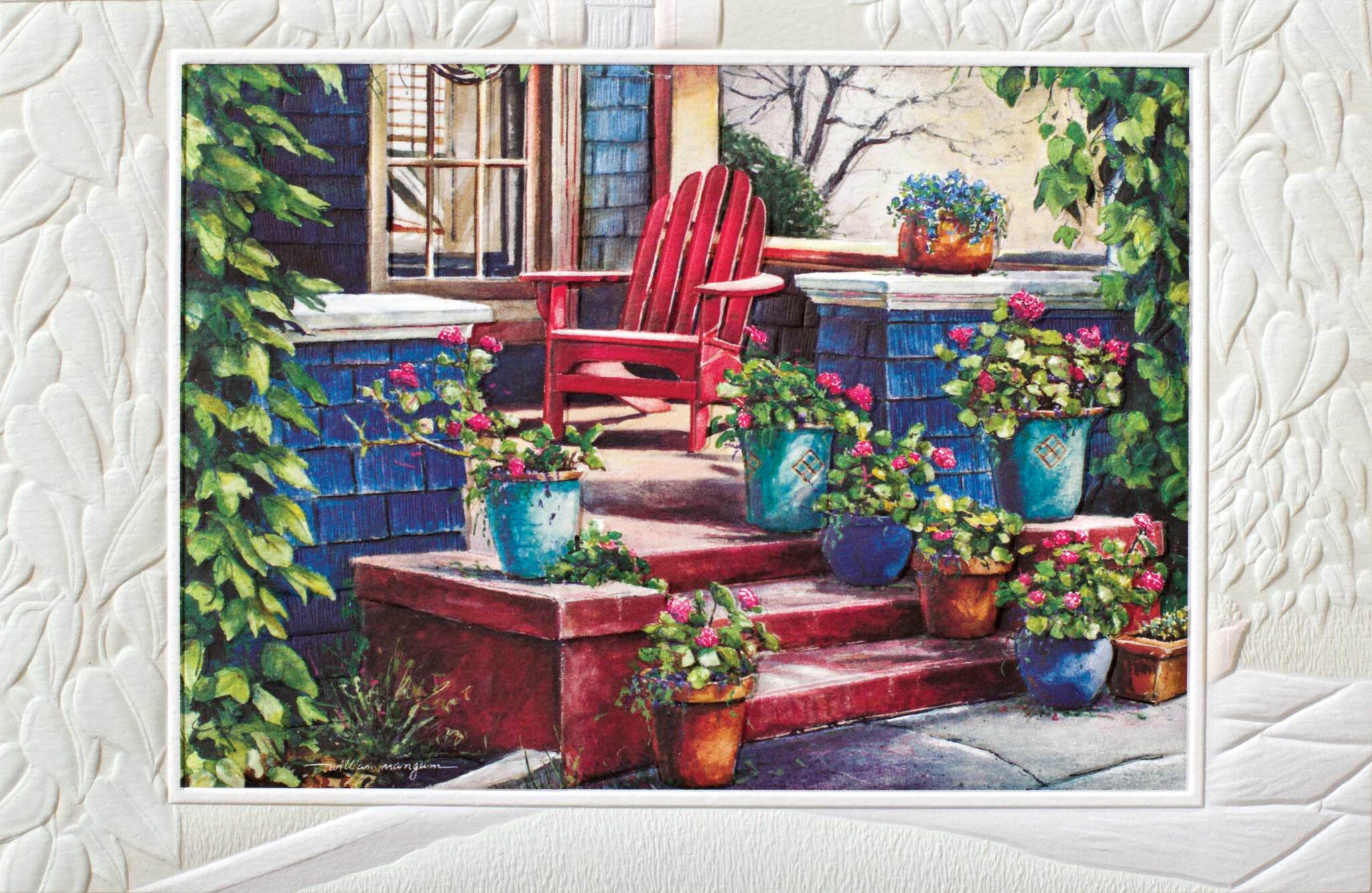 Gorgeous, embossed greeting card measures 8-1/4″ x 5-3/8″. Inside greeting: It’s your birthday… put your feet up, relax, and have a great one!