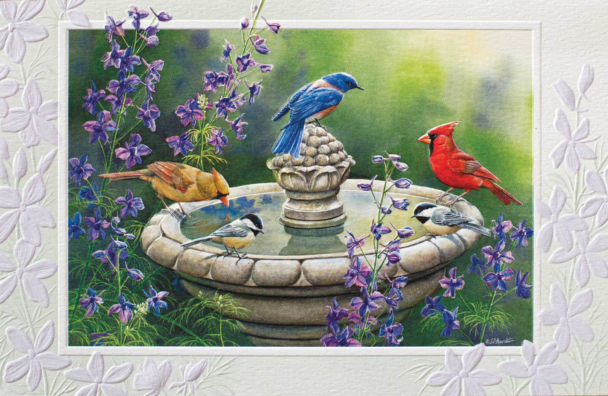 Gorgeous, embossed greeting card measures 8-1/4″ x 5-3/8″. Inside greeting: May your birthday be full of friends and fun. Enjoy!