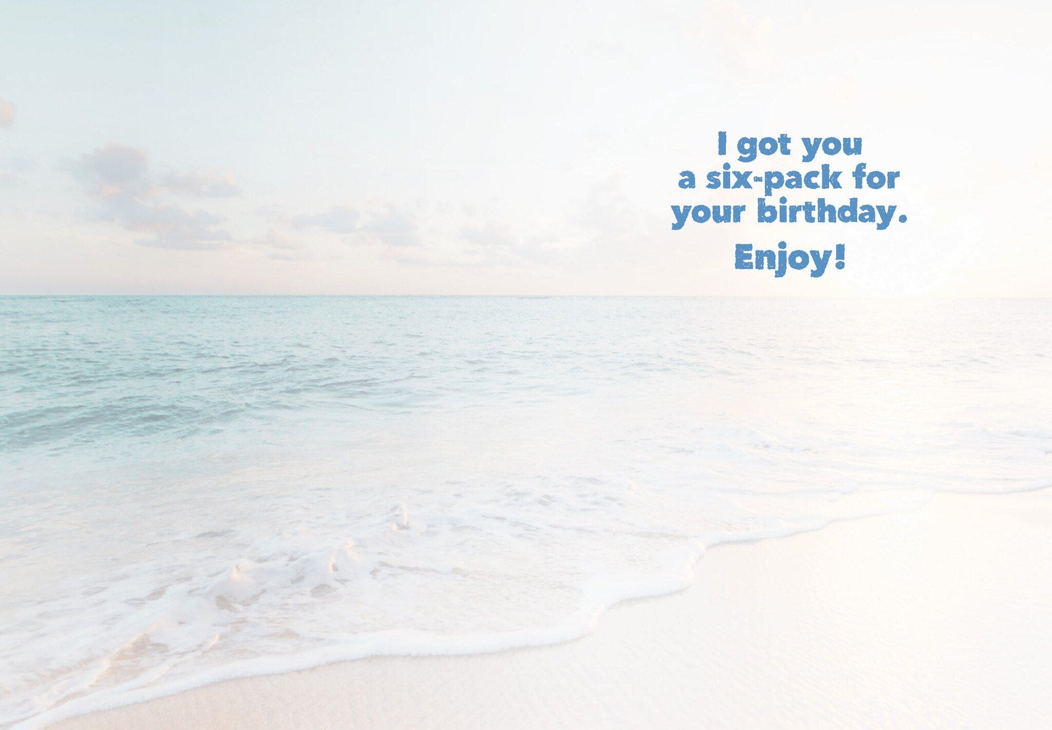 4.5″x6.25″, printed on coated paper, with coordinating envelope. Printed in Canada. Inside greeting: I got you a six-pack for your birthday. Enjoy!