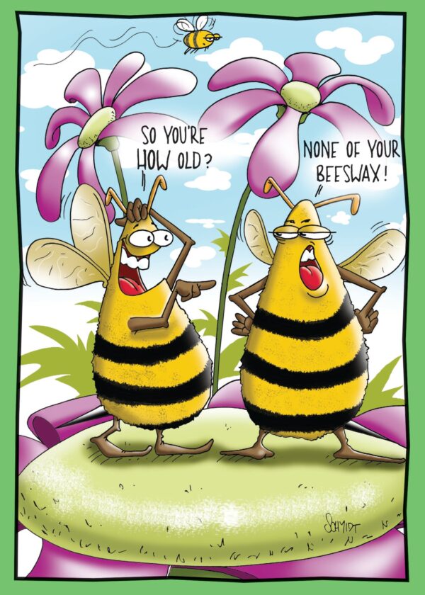 5 x 7″ greeting card printed in full-colour with a colour coordinated envelope. INSIDE: Bee as young as you feel. Happy Birthday!. Printed in Canada