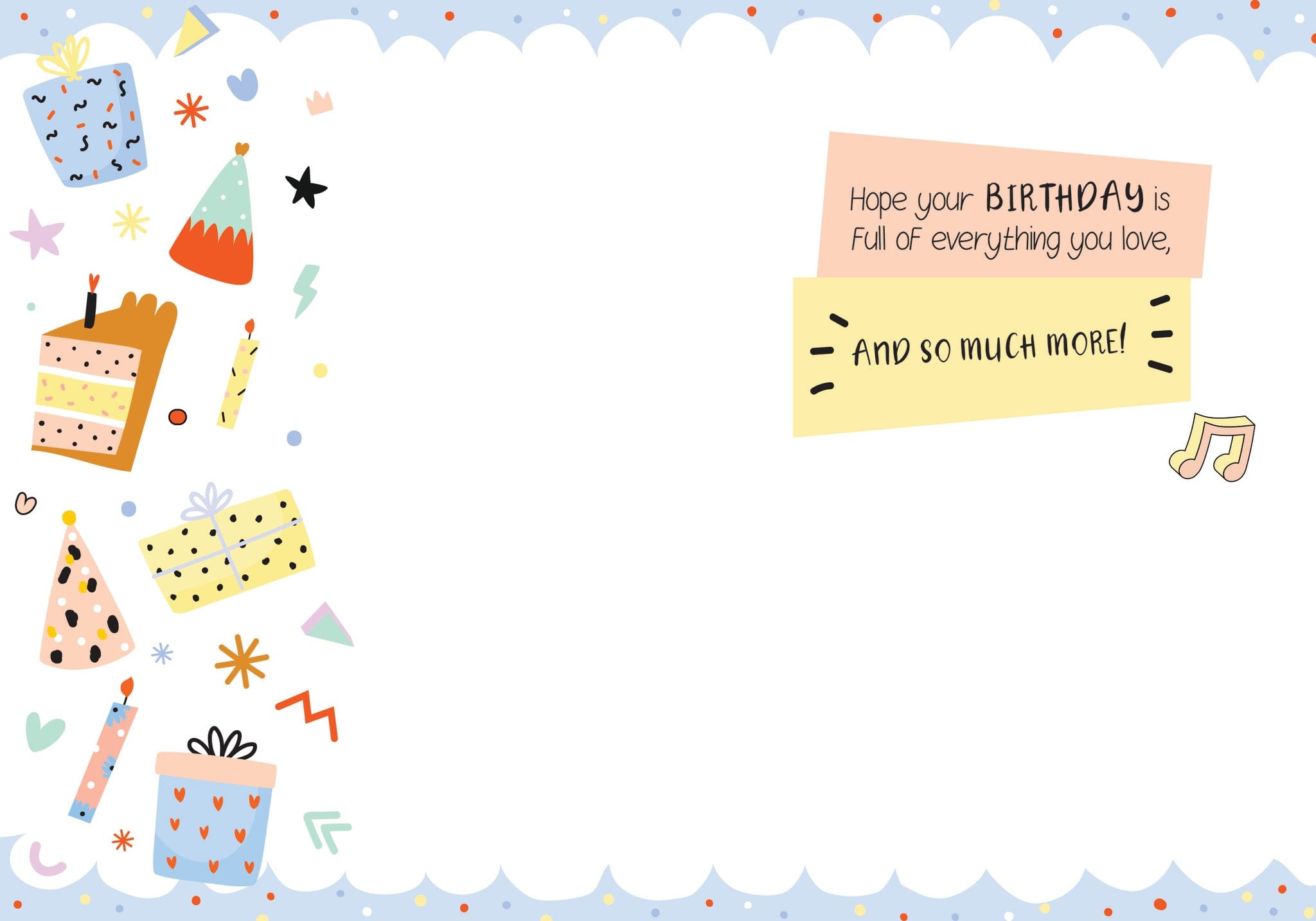 Each card measures 5″x7″ (13cmx18cm) and is printed in full colour on coated paper, comes with a coordinating colour envelope. Printed in Canada. Inside greeting: Hope your birthday is full of everything you love, and so much more!