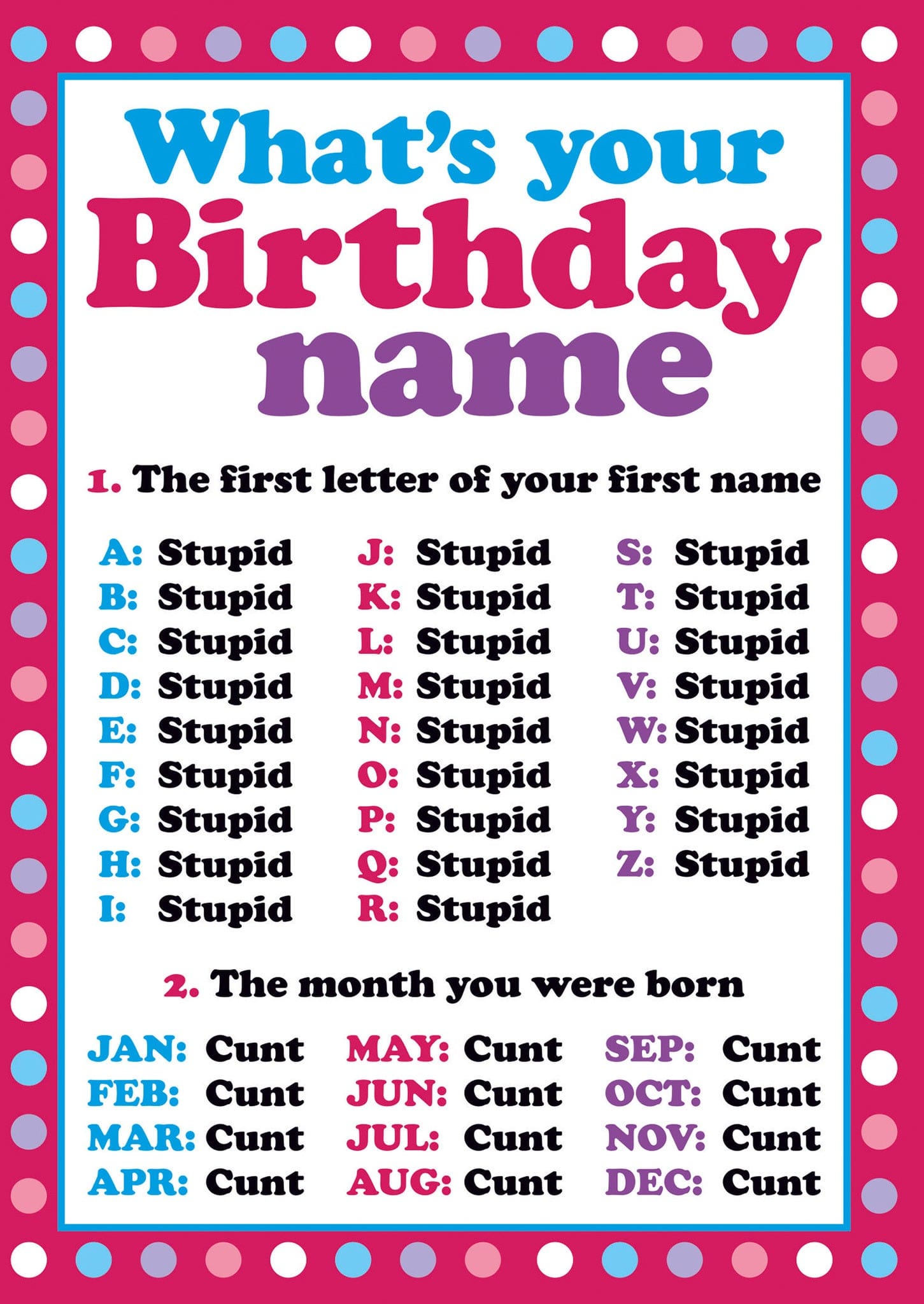 This greeting card measures 5″ x 7″. INSIDE: Since I know your name and birth date, I know for certain what you got. Happy Birthday, Stupid Cunt! Printed in Canada