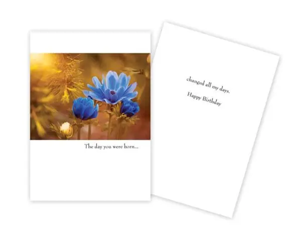 5″ x 7″ with white envelope. INSIDE: Changed all my days. Happy Birthday. Printed in Canada