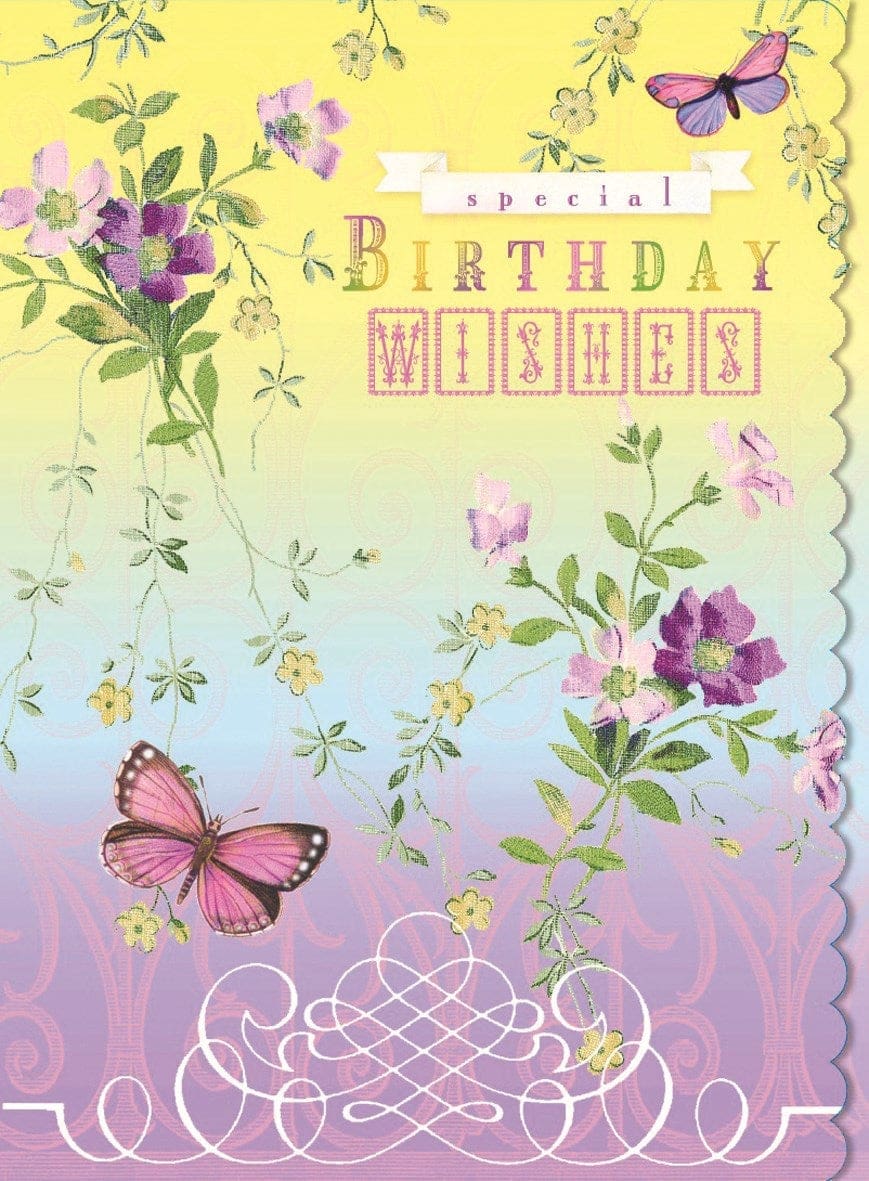 5″x7″cards with color coordinated envelope in a protective cello sleeve. INSIDE: May your birthday be special in every way! Happy Birthday.