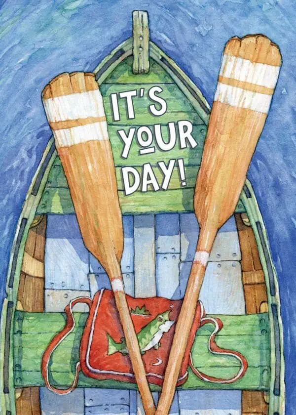 Each card measures 5″x7″ (13cmx18cm) and is printed in full colour on smooth paper, comes with a coordinating colour envelope. Printed in Canada. Inside greeting: Do whatever floats your boat! Happy Birthday