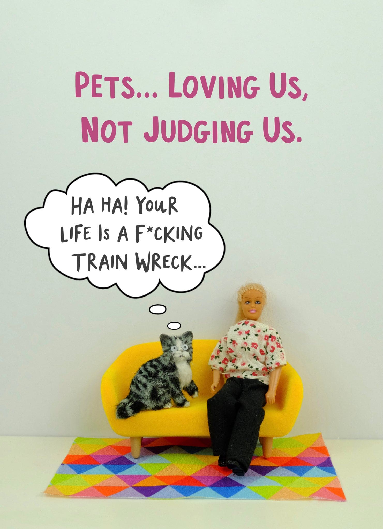 Greeting card measures 5 x 7″ and includes colourful envelope. INSIDE: Okay, the cat is more judgemental than I thought. I™m not judging you though, Happy Birthday! Printed in Canada