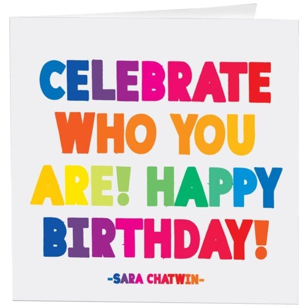 5″ square greeting card. Printed in Canada on recycled paper. Inside: celebrate who you are! happy birthday!