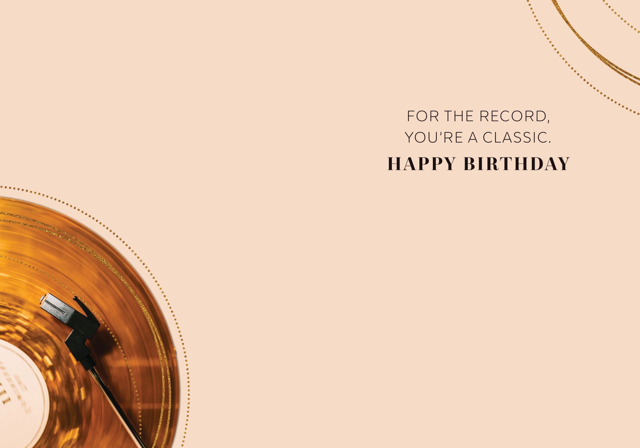 Each card measures 5″x7″ (13cmx18cm) and is printed in full colour on coated paper, comes with a coordinating colour envelope. Printed in Canada. Inside greeting: For the record, you’re a classic. Happy Birthday