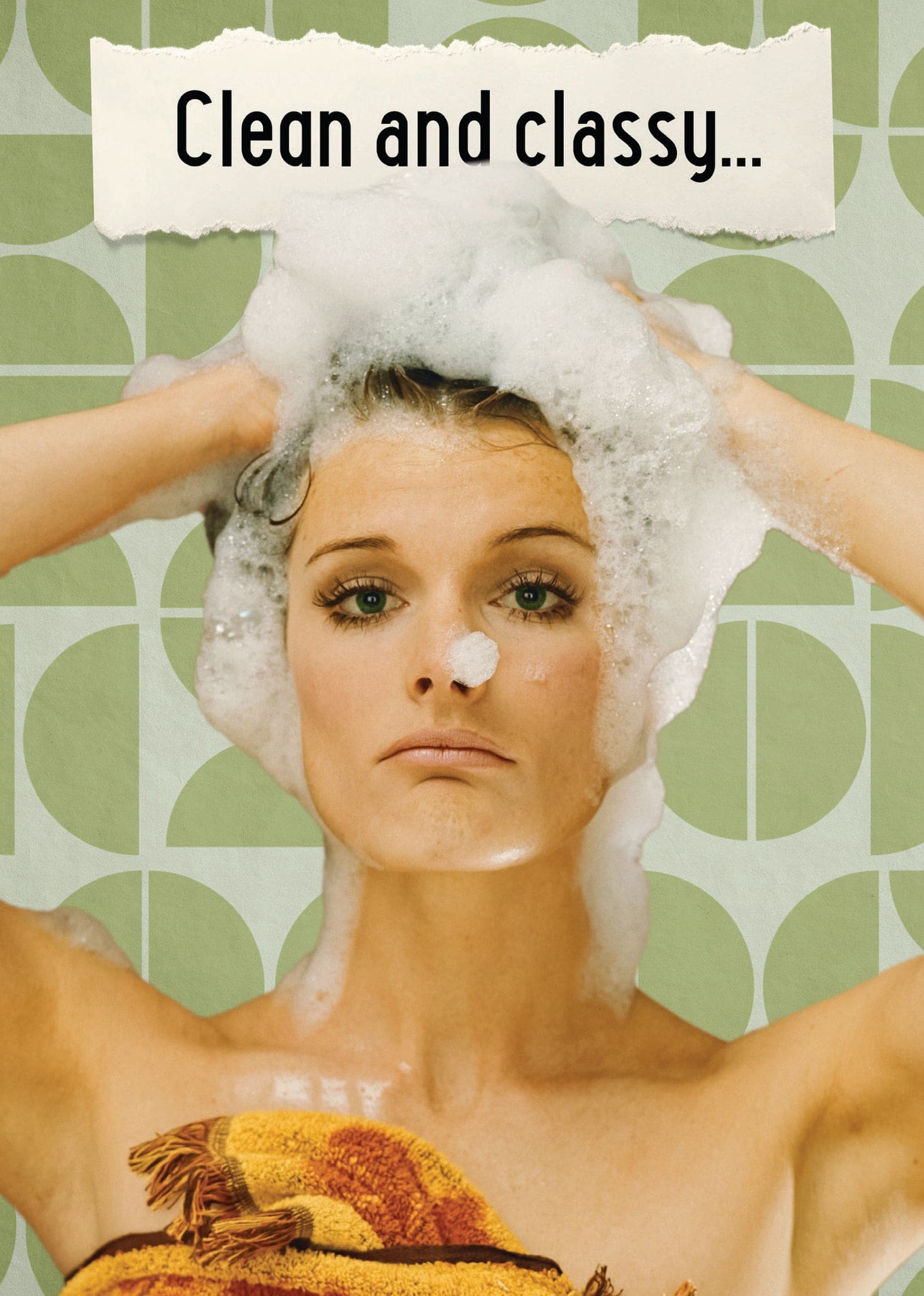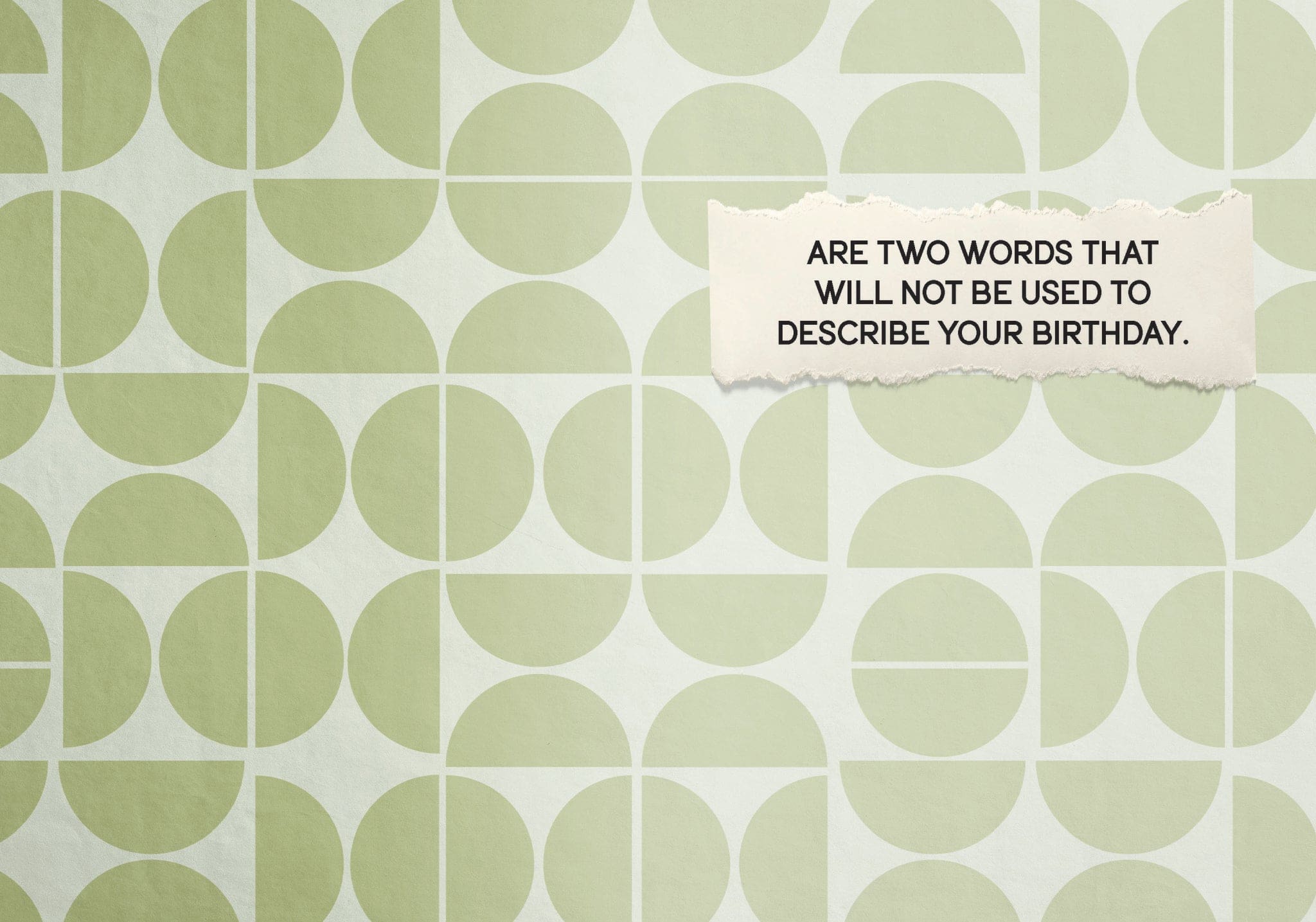 Each card measures 5″x7″ (13cmx18cm) and is printed in full colour on coated paper, comes with a coordinating colour envelope. Printed in Canada. Inside greeting: Are two words that will not be used to describe your birthday.