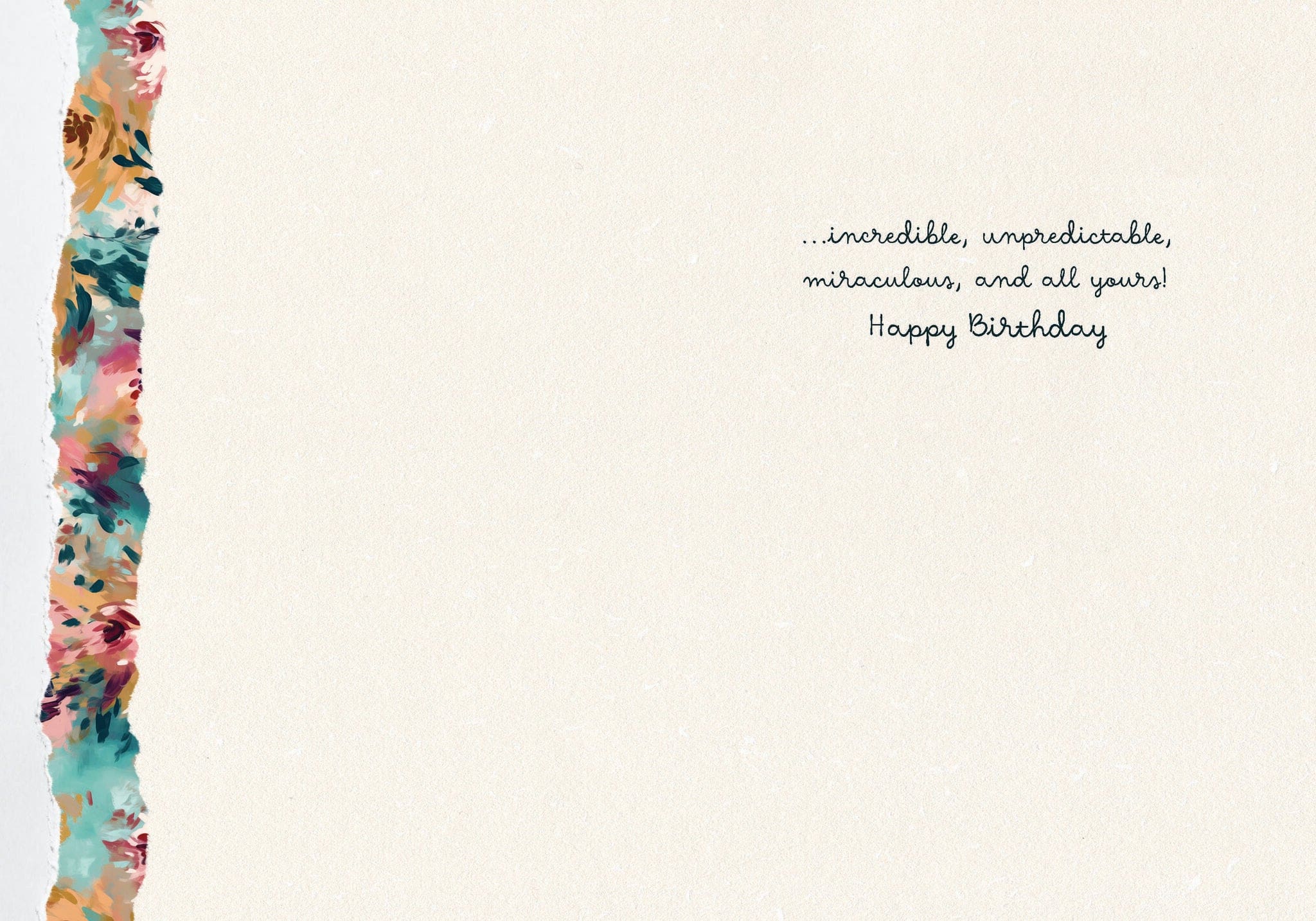 Each card measures 5″x7″ (13cmx18cm) and is printed in full colour on watercolour paper, comes with a coordinating colour envelope. Printed in Canada. Inside greeting: …incredible, unpredictable, miraculous, and all yours! Happy Birthday
