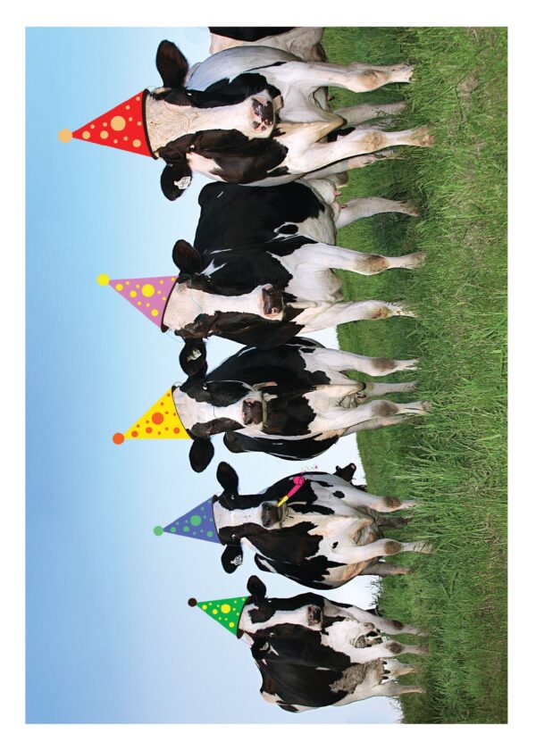 5 x 7″ greeting card printed in full-colour with a colour coordinated envelope. INSIDE: Party ’til the cows come home. Happy Birthday!. Printed in Canada