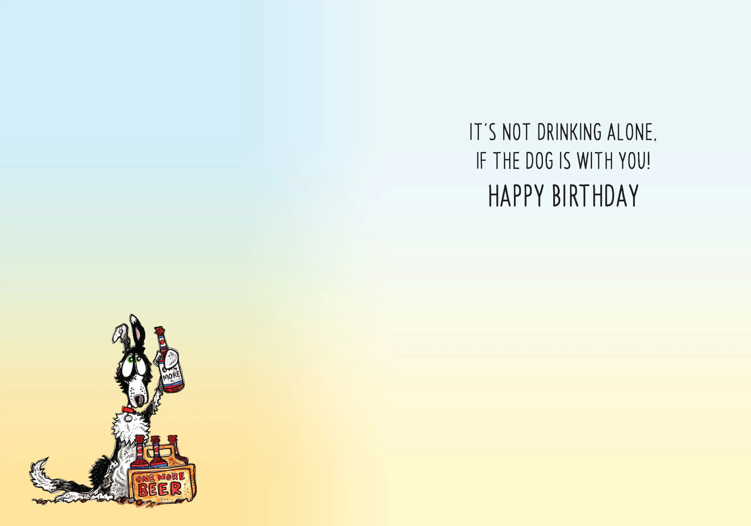 5″x7″, printed on coated paper, with coordinating envelope. Printed in Canada. Inside greeting: It’s not drinking alone, if the dog is with you! Happy Birthday