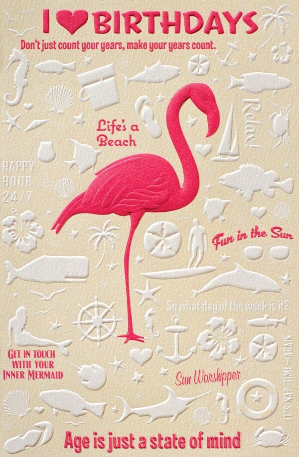 Gorgeous, embossed greeting card measures 8-1/4″ x 5-3/8″. Inside greeting: Everybody has birthdays, you just wear yours so well! Happy Birthday