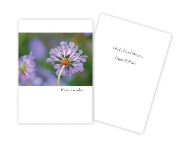 5″ x 7″ with white envelope. INSIDE: I find a friend like you. Happy Birthday. Printed in Canada