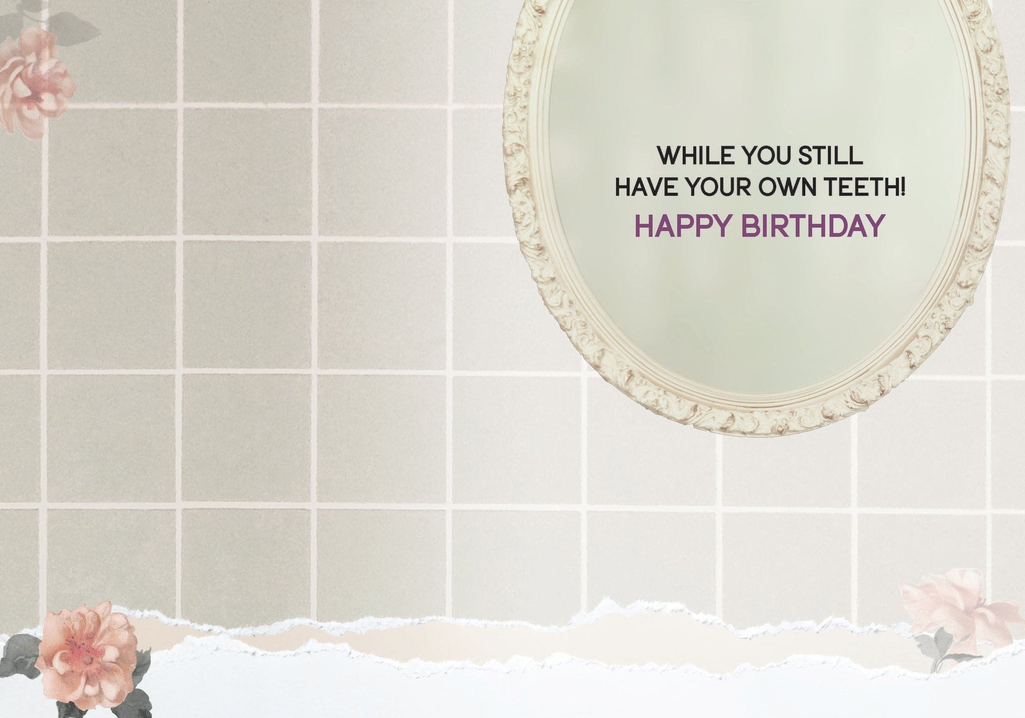 Each card measures 5″x7″ (13cmx18cm) and is printed in full colour on coated paper, comes with a coordinating colour envelope. Printed in Canada. Inside greeting: While you still have your own teeth! Happy Birthday