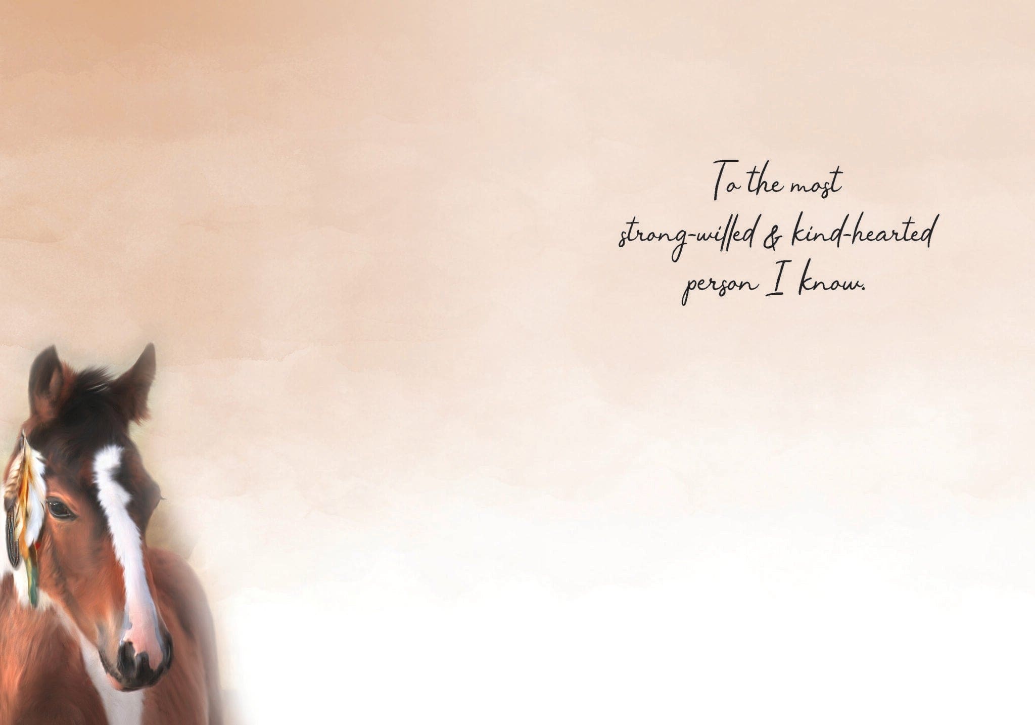 Each card measures 5″x7″ (13cmx18cm) and is printed in full colour on linen paper, comes with a coordinating colour envelope. Printed in Canada. Inside greeting: To the most strong-willed & kind-hearted person I know.