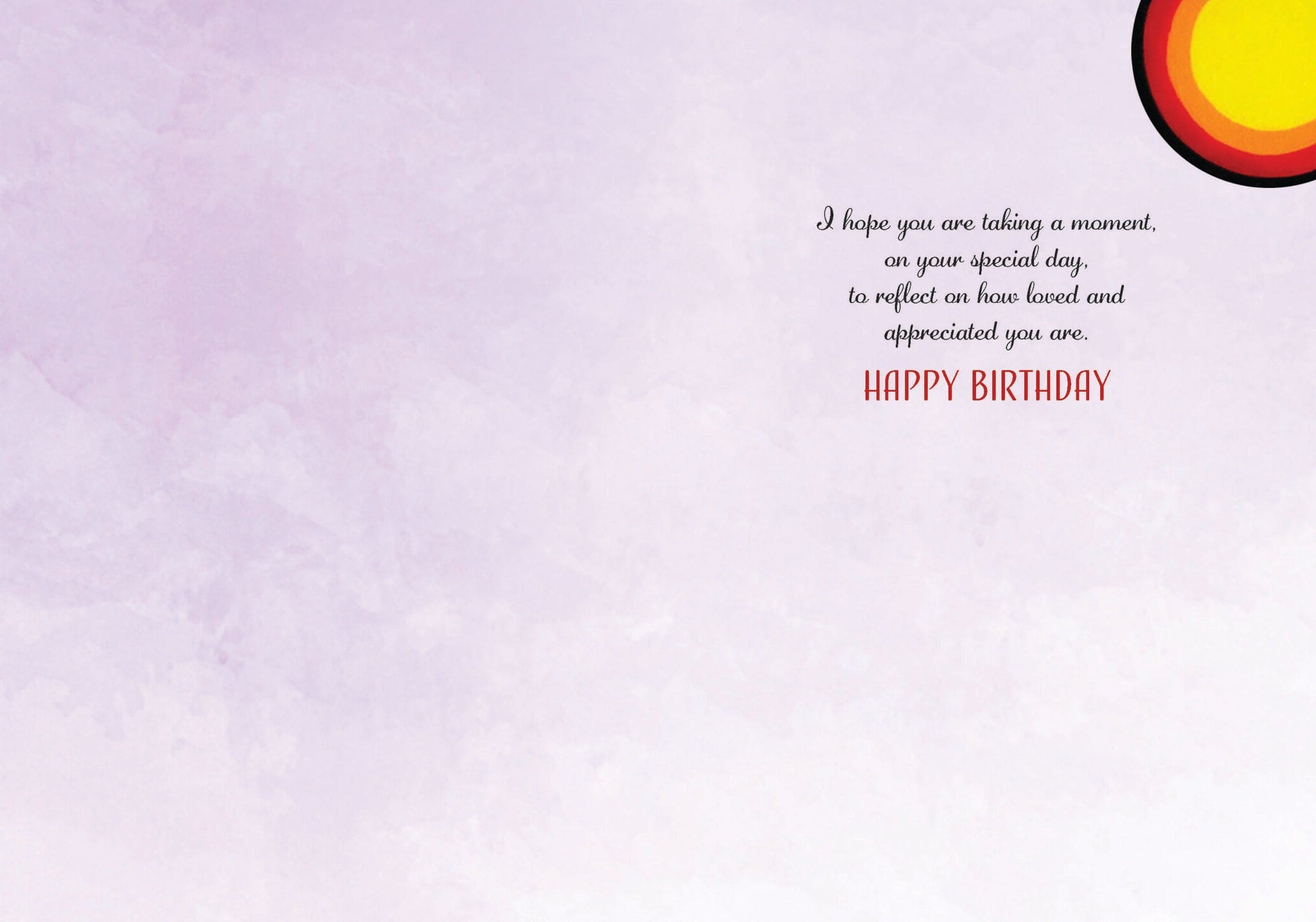Card measures 5″x7″ printed in full colour on linen paper, comes with a coordinating colour envelope. Printed in Canada. Inside greeting: I hope you take a moment on your special day, to reflect on how loved and appreciated you are. Happy Birthday