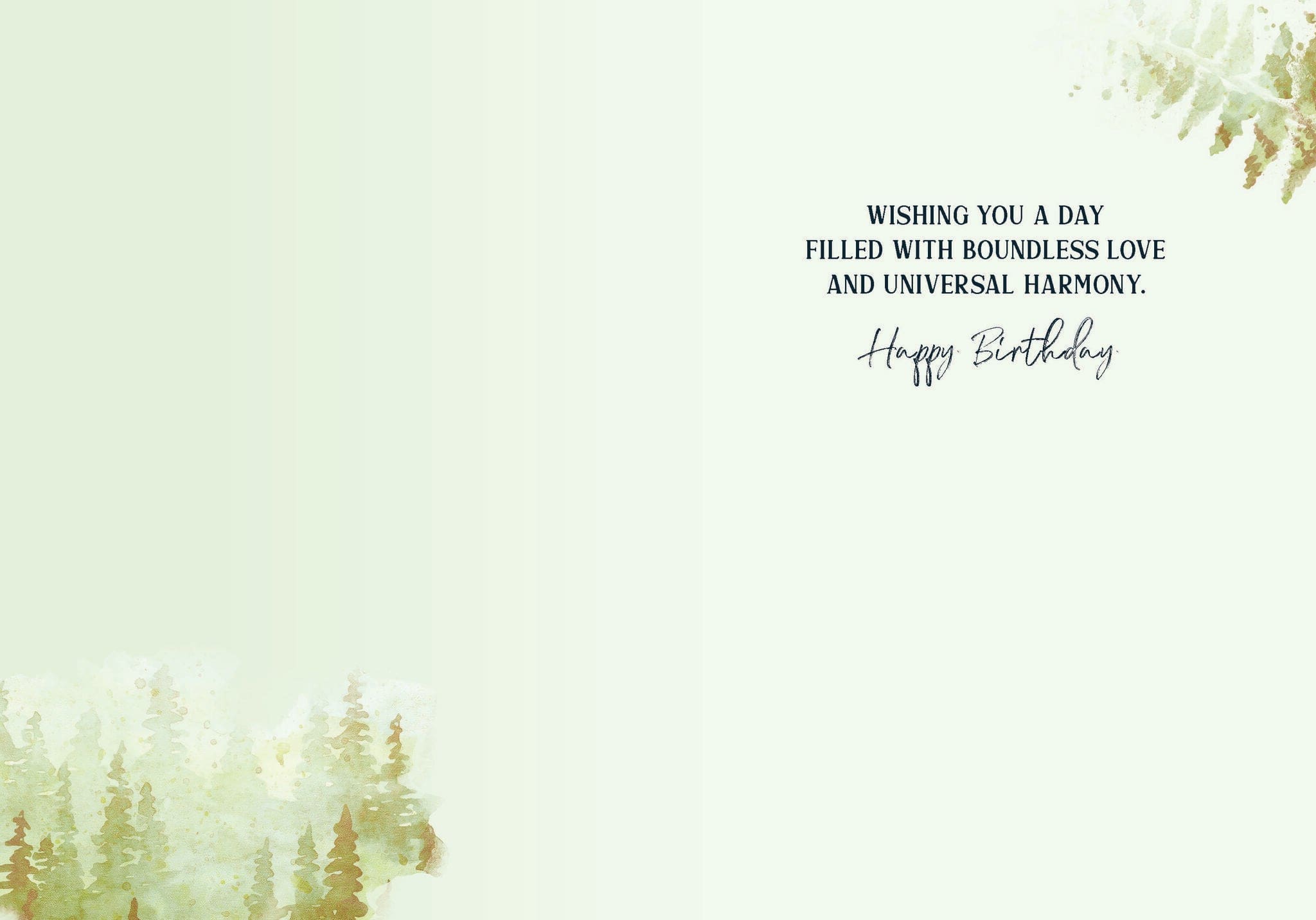 Each card measures 5″x7″ (13cmx18cm) and is printed in full colour on watercolour paper, comes with a coordinating colour envelope. Printed in Canada. Inside greeting: Wishing you a day filled with boundless love and universal harmony. Happy Birthday