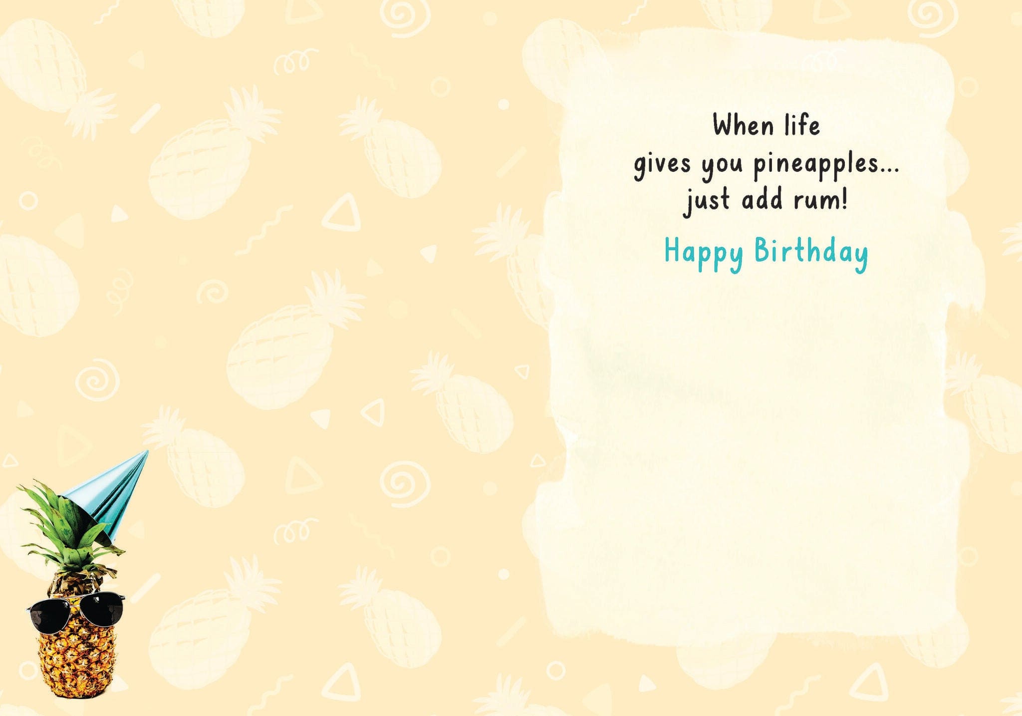 Each card measures 5″x7″ (13cmx18cm) and is printed in full colour on coated paper, comes with a coordinating colour envelope. Printed in Canada. Inside greeting: When life gives you pineapples… just add rum! Happy Birthday