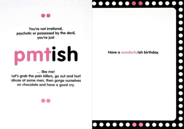 Size: 5″x7″, Humour, Ishey, 4 colour print, embrossing, Inside: Have a wonderfulish birthday.