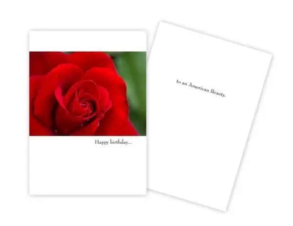 5″ x 7″ with white envelope. INSIDE: to an American Beauty. Printed in Canada