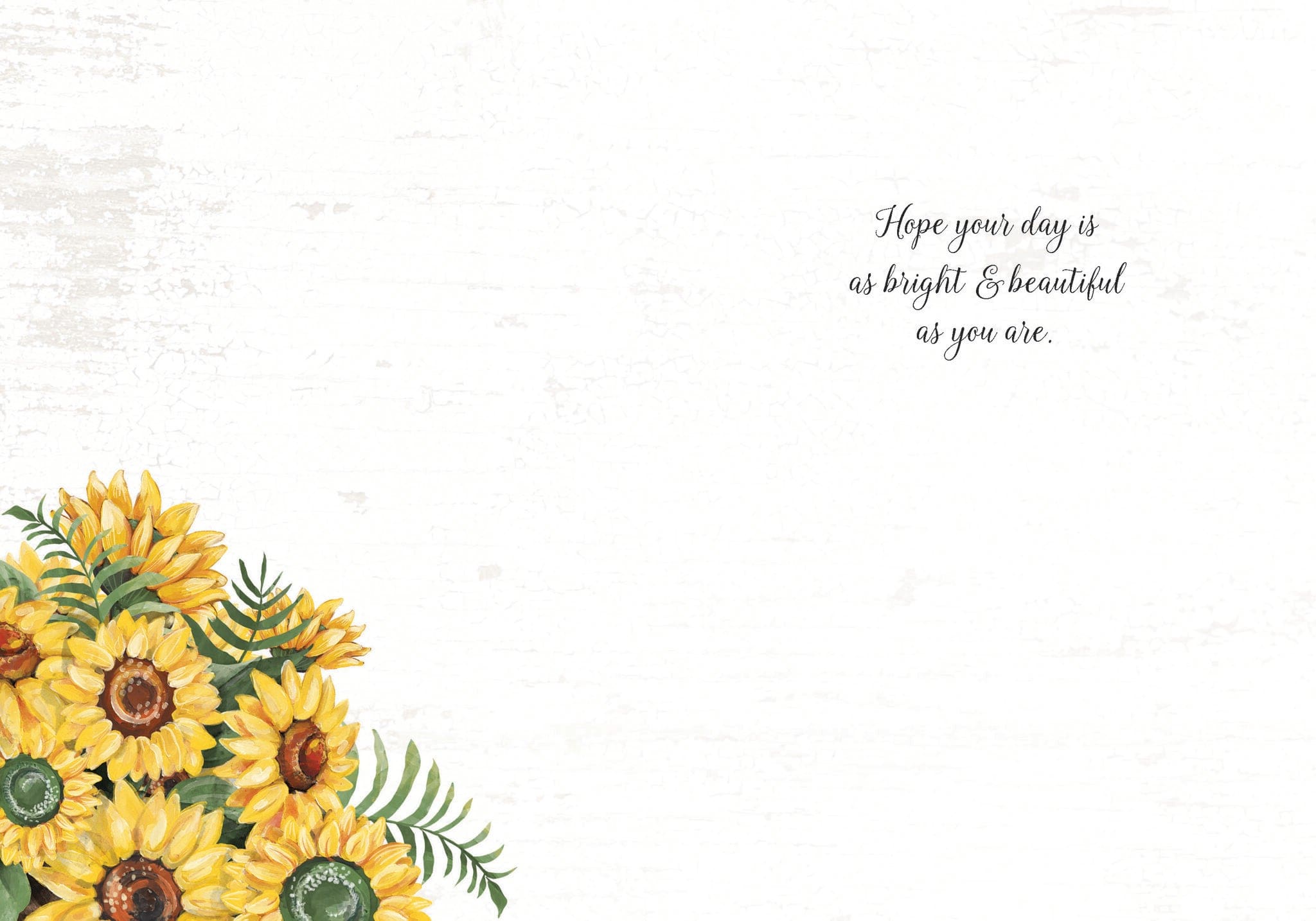 Each card measures 5″x7″ (13cmx18cm) and is printed in full colour on watercolour paper, comes with a coordinating colour envelope. Printed in Canada. Inside greeting: Hope your day is as bright & beautiful as you are.