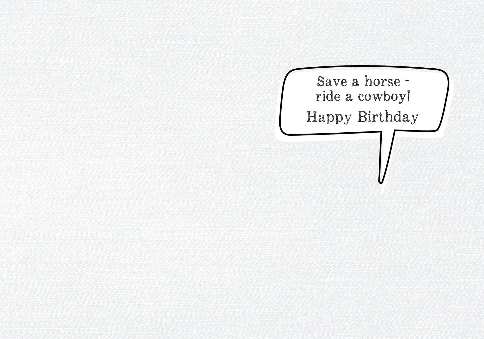 Each card measures 5″x7″ (13cmx18cm) and is printed in full colour on coated paper, comes with a coordinating colour envelope. Printed in Canada. INSIDE: Save a horse – ride a cowboy! Happy Birthday
